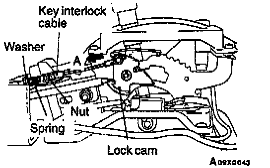 3. While lightly pushing the cable coupling portion of the lock cam in the direction A, tighten the nut to fasten the key interlock cable.