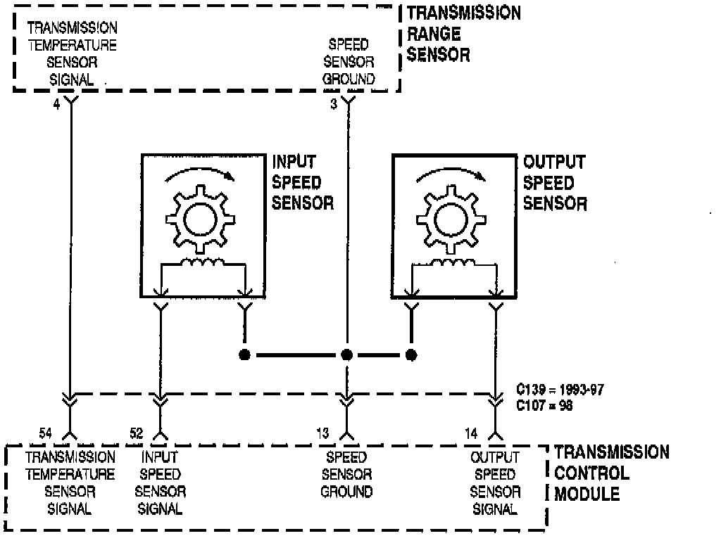 - Failed input or output speed sensor (intermittent or hard code)
