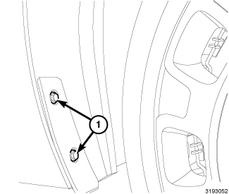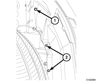 4. Remove the three fasteners (1, 2) located forward of the wheel securing the splash shield to the vehicle.