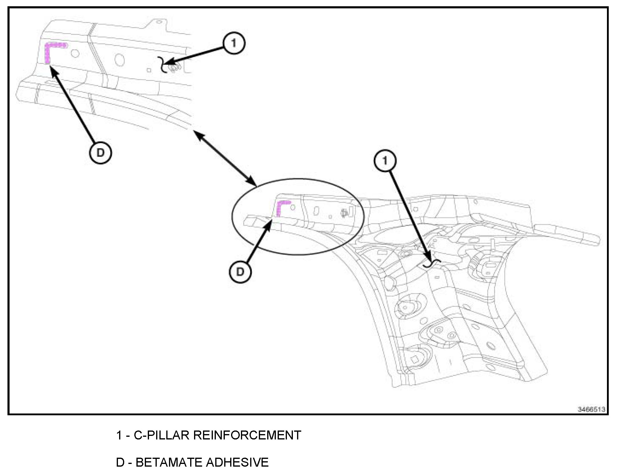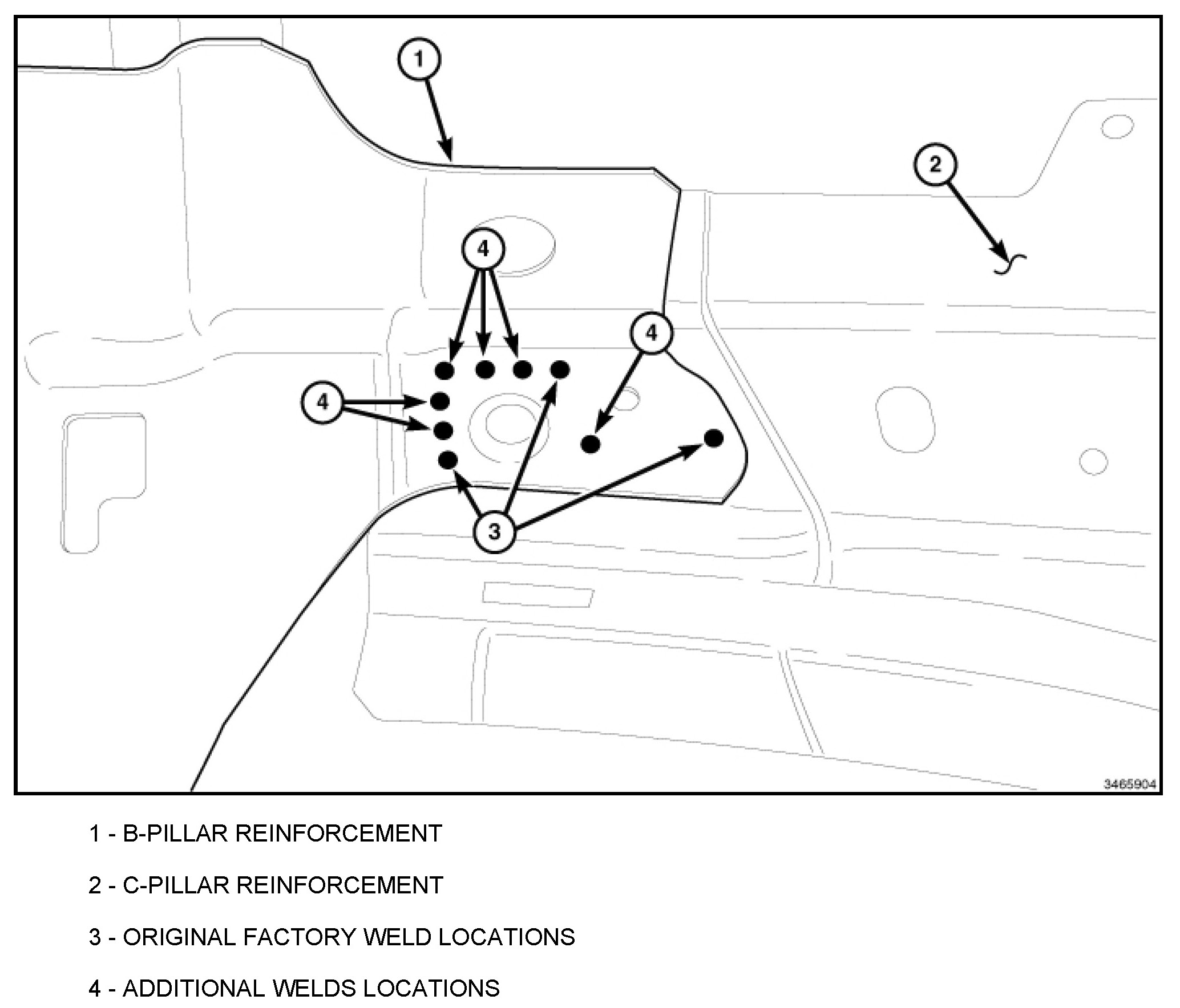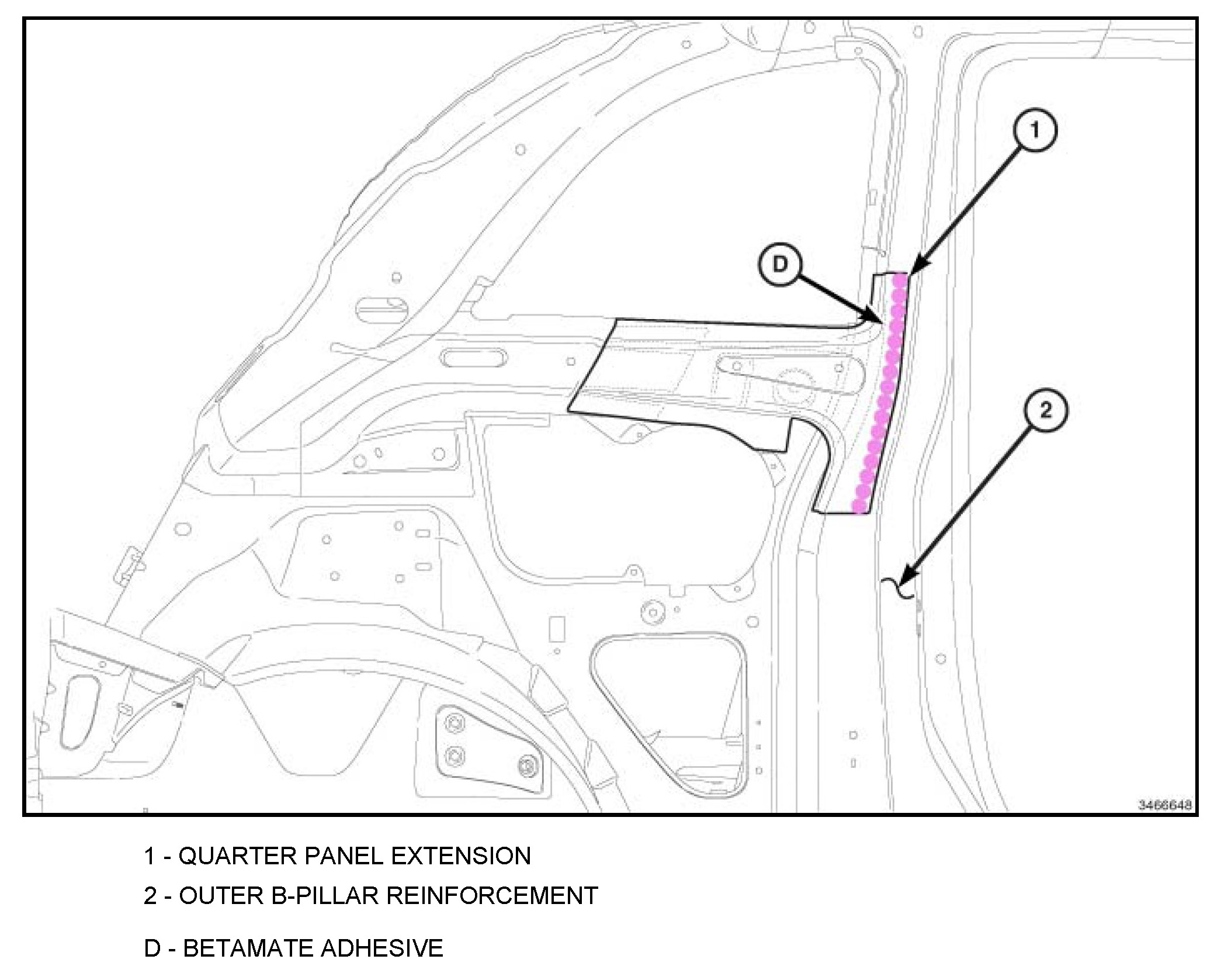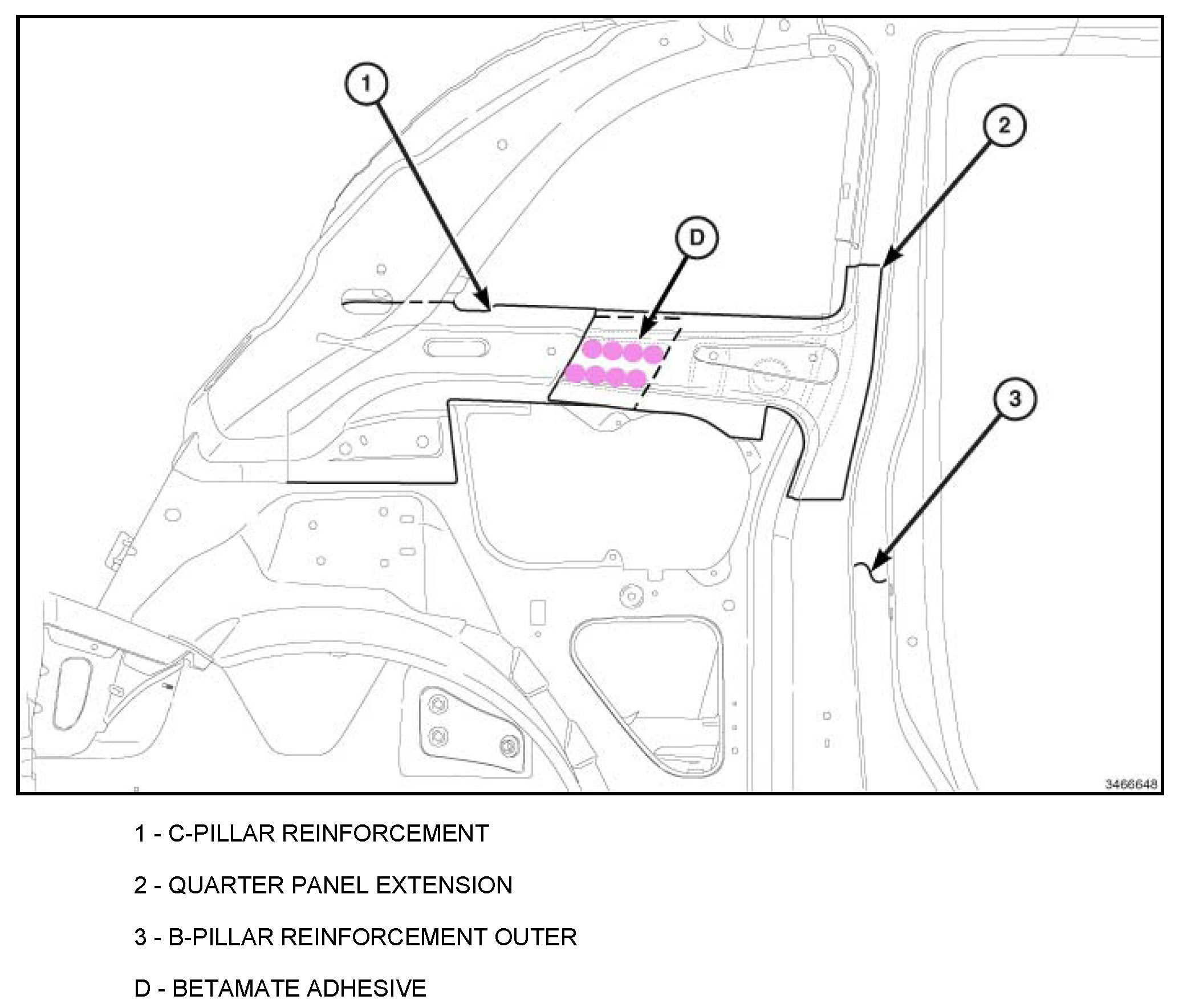 The Betamate Adhesive that was originally applied in the C-pillar Reinforcement to the B-pillar Reinforcement lap joint will be completely deleted. Substitute Betamate Adhesive with the use of additional plug welds.