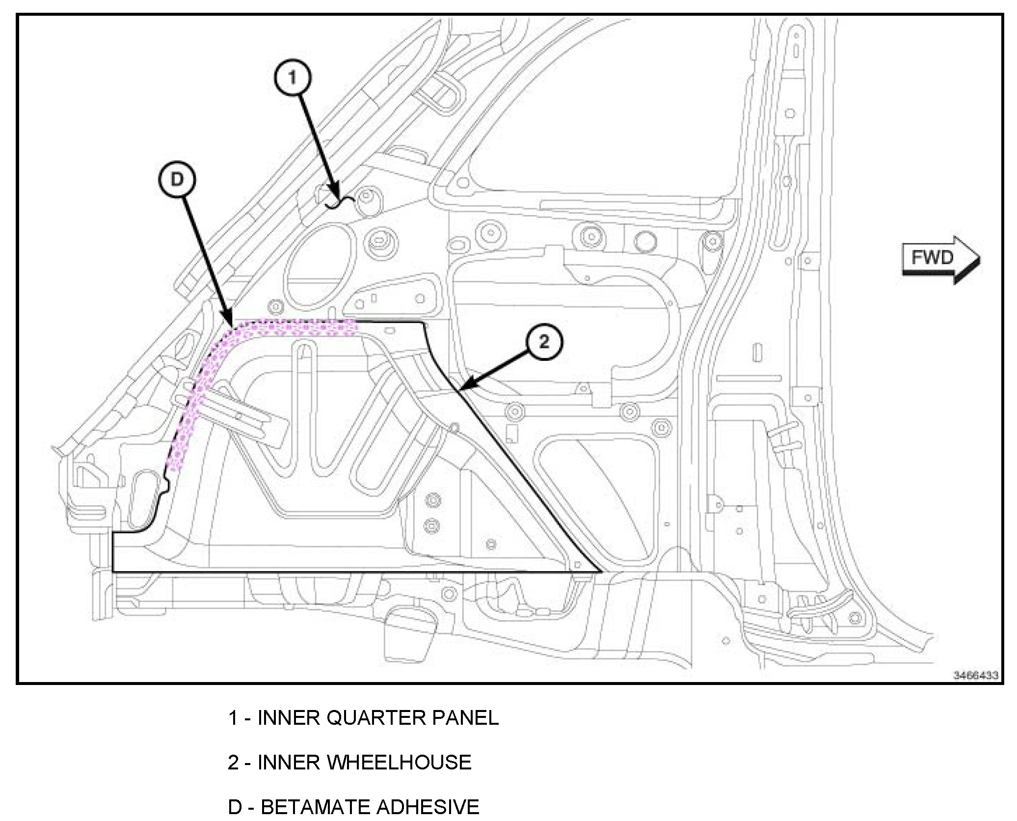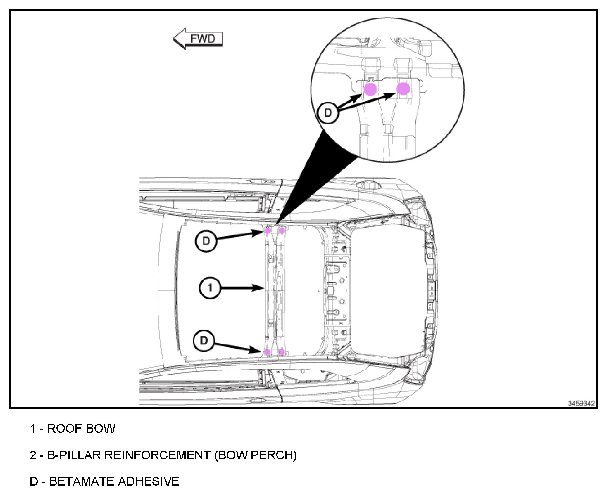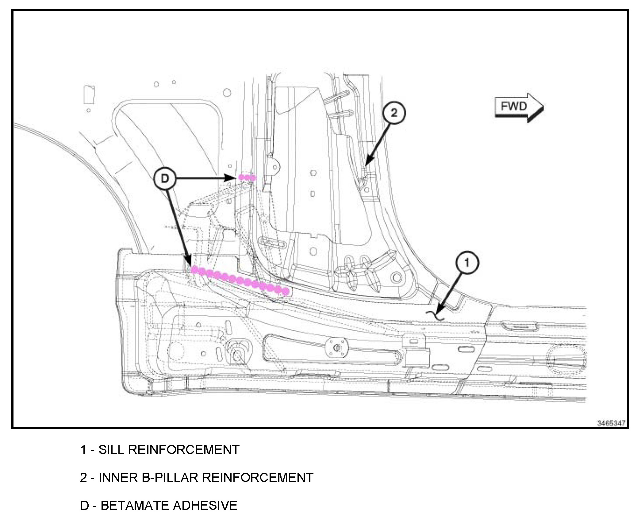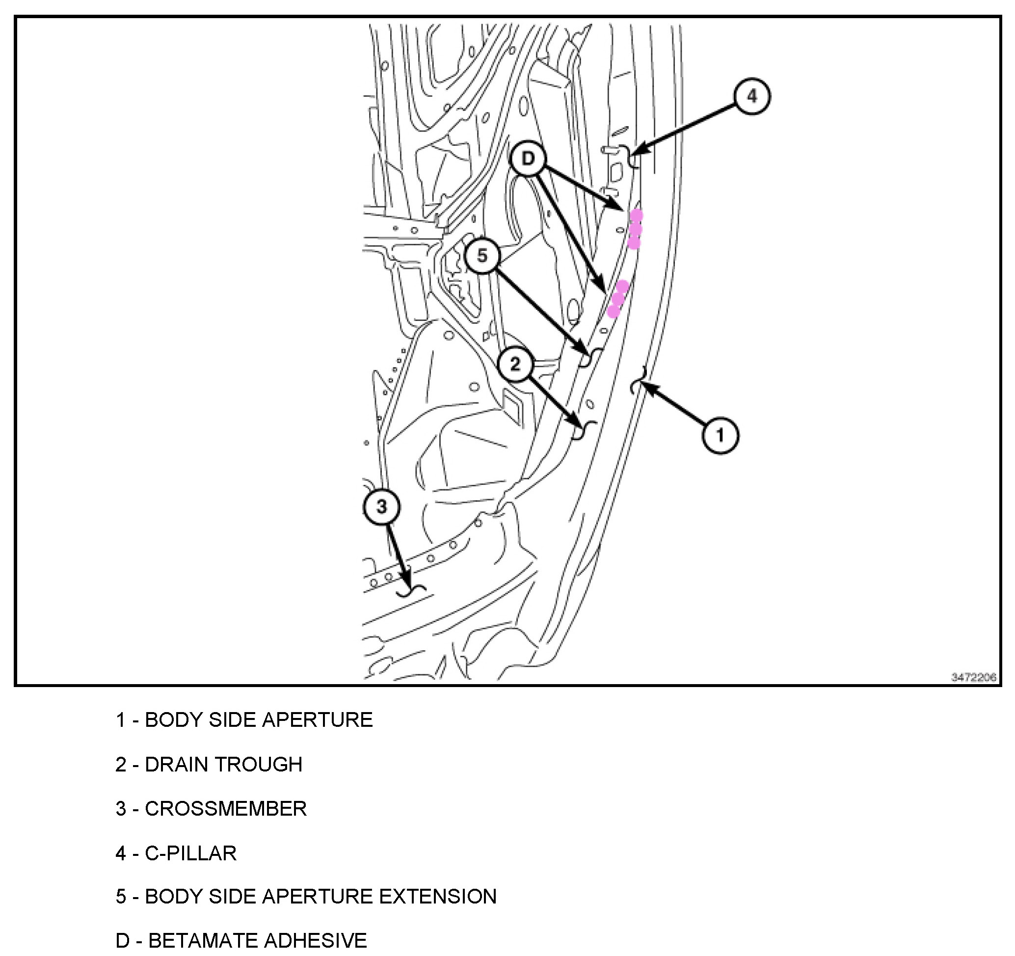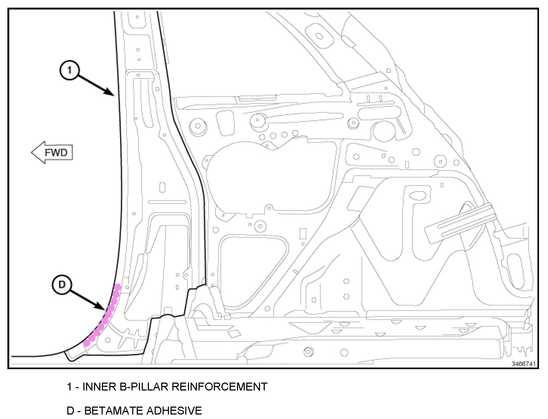 The Betamate Adhesive that was originally applied in the C-pillar Reinforcement to the B-pillar Reinforcement lap joint will be completely deleted. Substitute Betamate Adhesive with the use of additional plug welds.