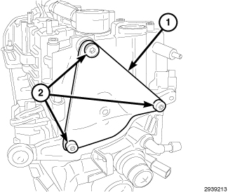 11. If the bolt (2) does not align with the lower timing belt cover mounting boss, the camshaft timing is not correct. Proceed to the timing belt service procedures Timing Belt - Removal.