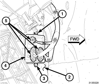 1. Install the blower motor power module (4) to the right side of the HVAC housing (2) and install the two retaining screws (1 and 3). Tighten the screws to 0.8 Nm (7 in. lbs.).