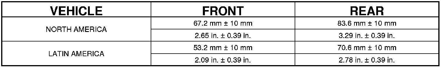 NOTE: Prior to reading the curb height measurement, the front and rear of the vehicle must be jounced to settle the suspension. Induce jounce by pushing down on the center of the bumper (fascia), using care not to damage the vehicle, moving the vehicle up and down, gradually increasing the suspension travel with each stroke. Release the bumper at the bottom of each stroke, repeating this action several times. Perform this to both front and rear suspensions an equal amount of times.