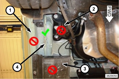 1. Place the front lift pads (4) onto the front floor reinforcement (1).