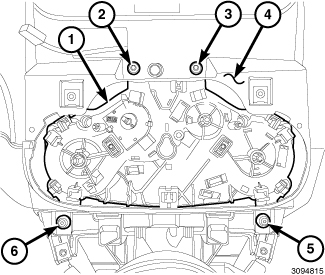 32. Install the four screws (2, 3, 5 and 6) that secure the A/C heater control (1) to the instrument panel cover (4). Tighten the screws securely.