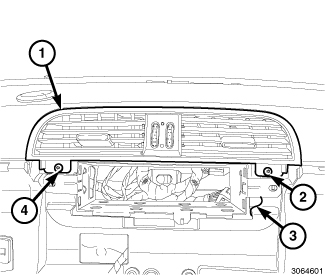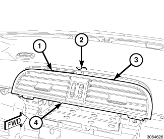 23. Install the center air outlet by engaging the two retaining tabs (1 and 3) that secure the top of the center air outlet (4) to the instrument panel (2).