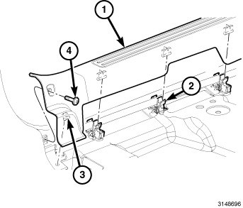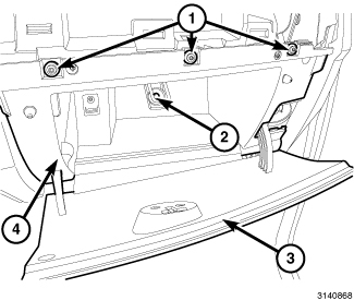 22. Close the glove box door (3) and install the two screws securing the module to the instrument panel cover located on the bottom front edge of glove box module (4).