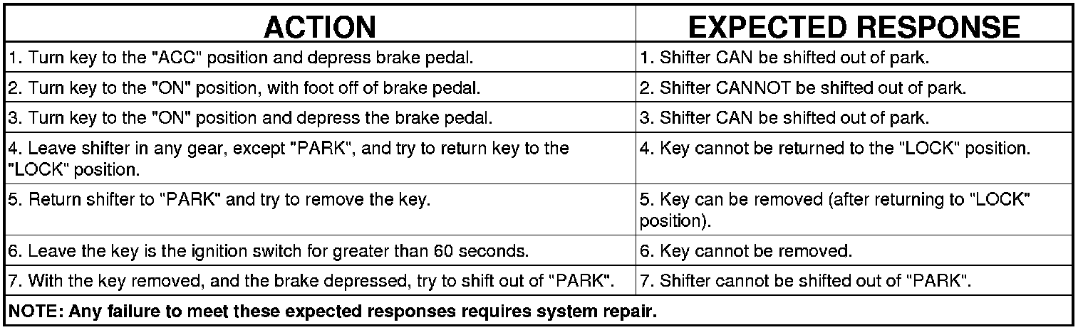 The following chart describes the normal operation of the Brake Transmission Shift Interlock (BTSI) system. If the "expected response" differs from the vehicle's response, then system repair and/or adjustment is necessary.