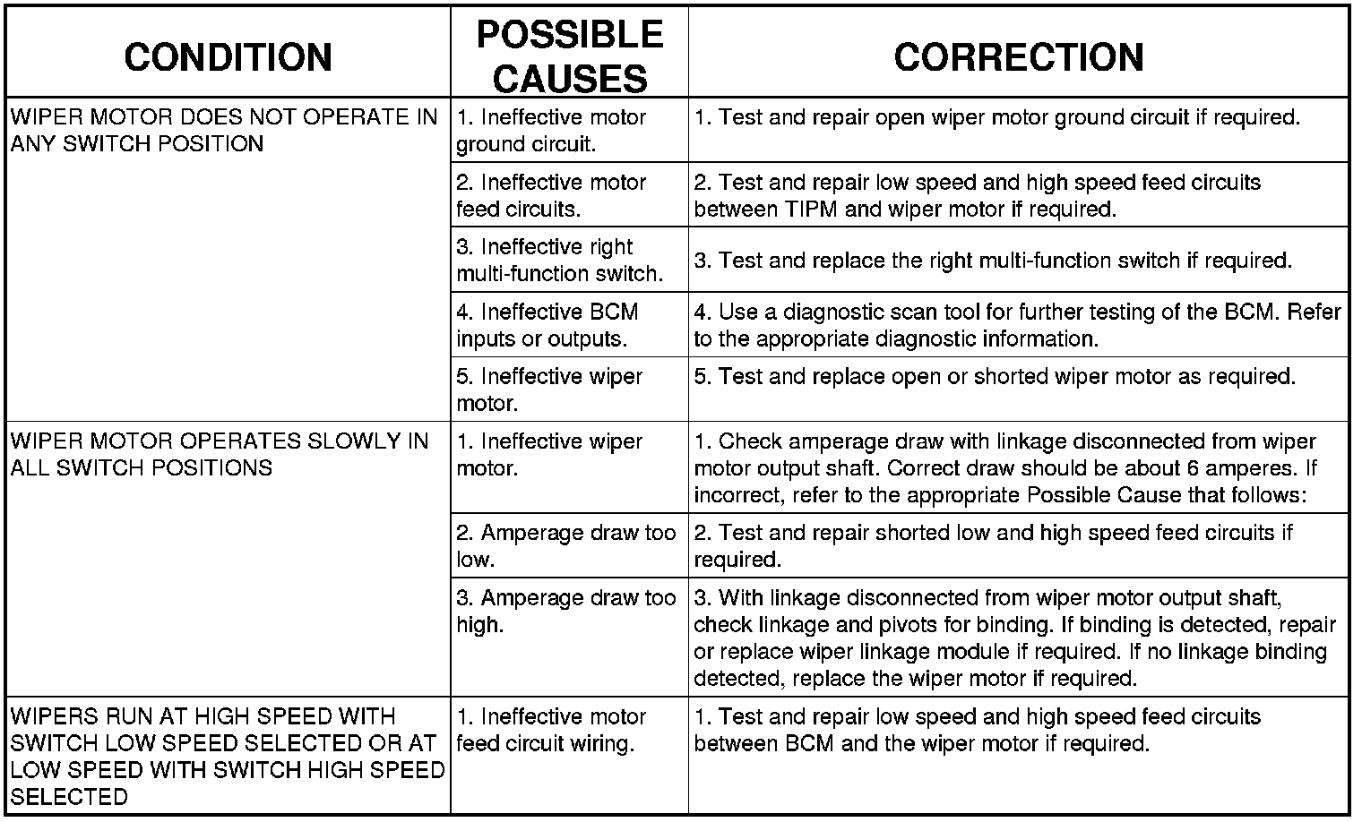 If the front wiper motor operates, but the wipers do not move on the windshield, replace the ineffective front wiper motor or wiper linkage module. If the washer pump/motor operates, but no washer fluid is dispensed on the glass; or, if the wipers operate, but chatter, lift, or do not clear the glass, clean and inspect the front wiper and washer system components as required. Wipers And Washers - Cleaning and Wipers And Washers - Inspection.