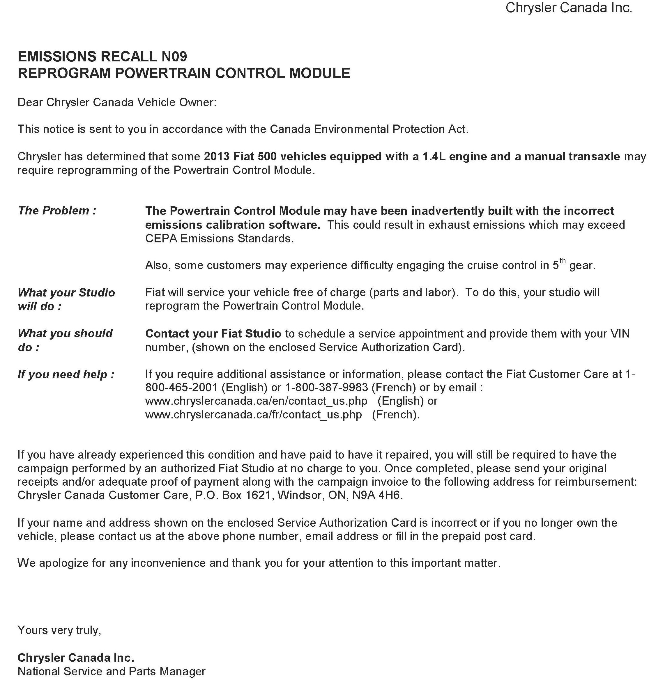 Canada - Recall - ECM Update For Emissions Calibration