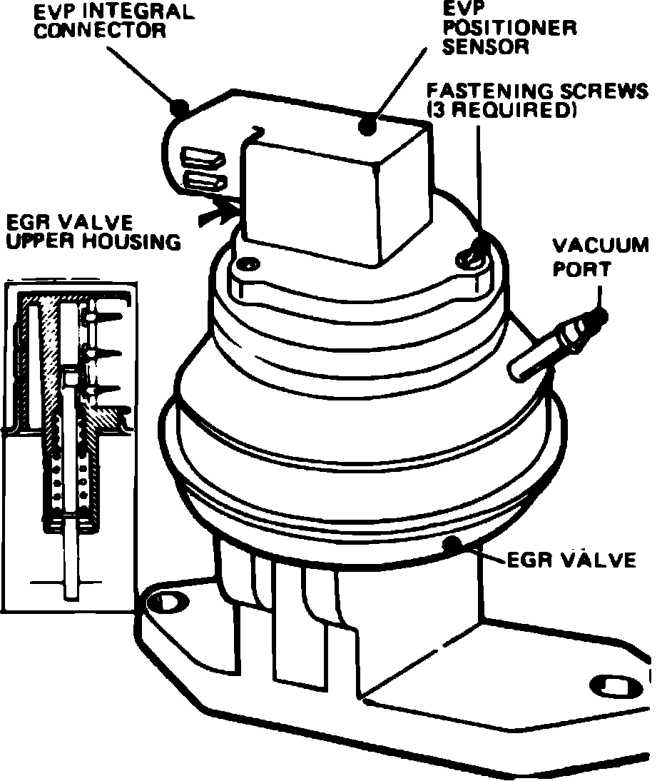 This sensor, Fig. 6, is used to monitor the EGR valve pintle position. The computer applies a reference voltage to the EVP sensor, and the resulting signal from the EVP sensor is proportional to the amount of exhaust gases flowing through the EGR valve pintle into the intake manifold. Depending on the input from this and other sensors, the computer can increase or decrease EGR flow by activating or deactivating a pair of solenoid vacuum valves.