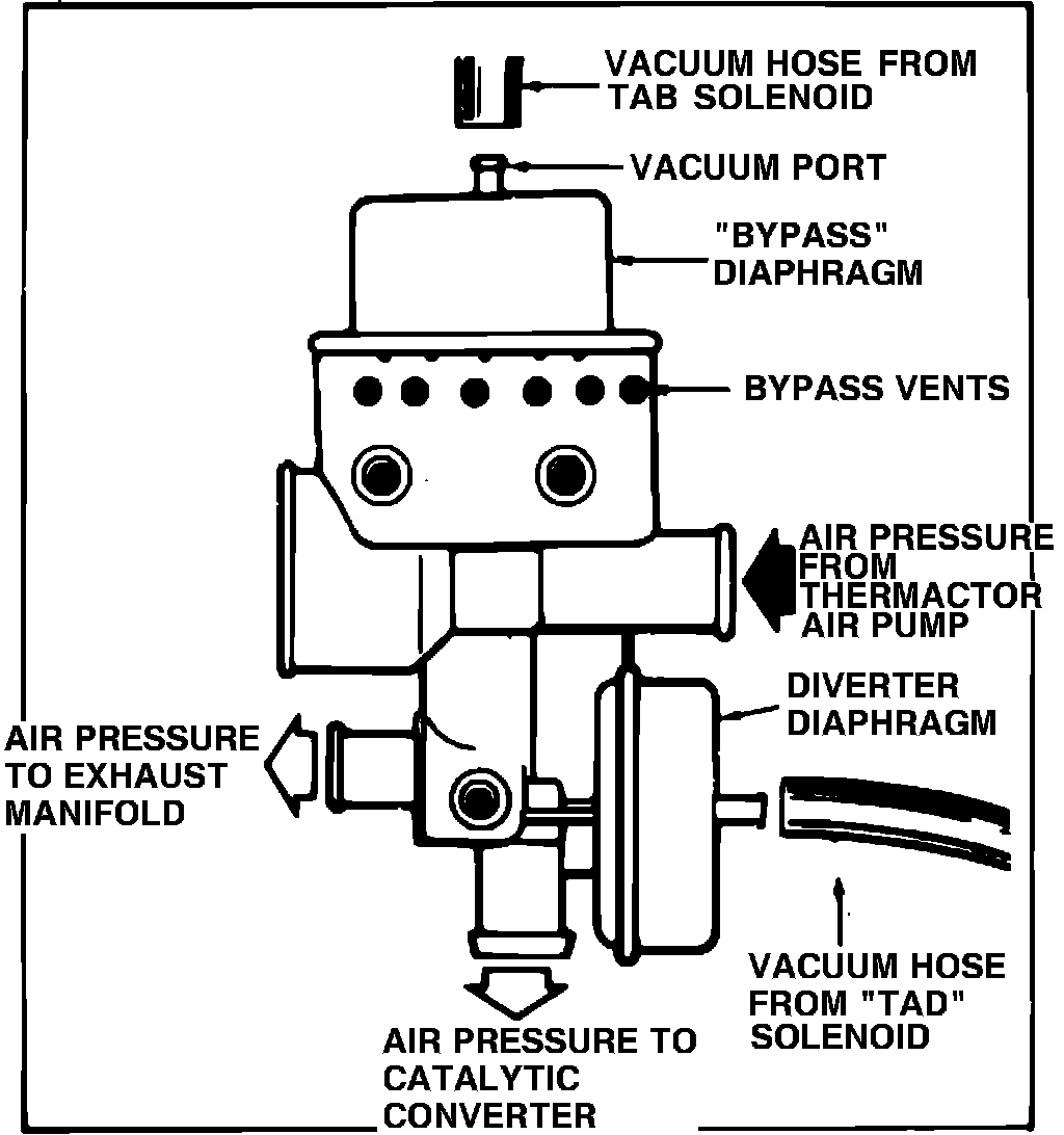 The appropriate routing for thermactor air is determined by the ECA based on the engine coolant temperature versus time curve and other sensor parameters. The actual values are according to calibration. During normal coolant temperature operation the thermactor air is normally directed downstream. This downstream mode can be modified by sensor inputs to the ECA. The thermactor air is bypassed when time at closed throttle exceeds a set time value. Thermactor air will also be bypassed if the time between the EGO lean/rich sensor exceeds a set time value. The above mentioned time values are for catalyst damage prevention and/or vehicle safety. The thermactor air will also be bypassed during wide open throttle or during extended closed throttle operation. During warm-up the thermactor air will be directed upstream. This is to remove excessive amounts of HC and CO produced during the warm-up period. The bypass/diverter valve is operated by controlling vacuum from the intake manifold vacuum reservoir.