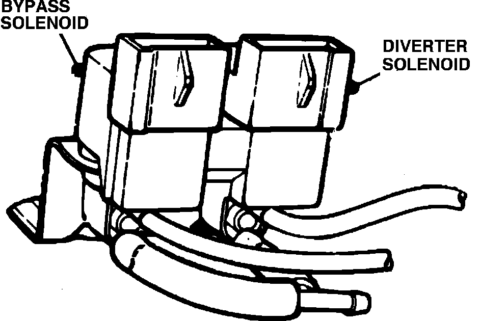 The bypass/diverter valve, Fig. 15, operation is controlled by two solenoid valves. The valves are mounted on the right hand fender apron. The solenoid closest to the rear is a diverter solenoid, while the forward solenoid is a bypass solenoid, Fig. 16.