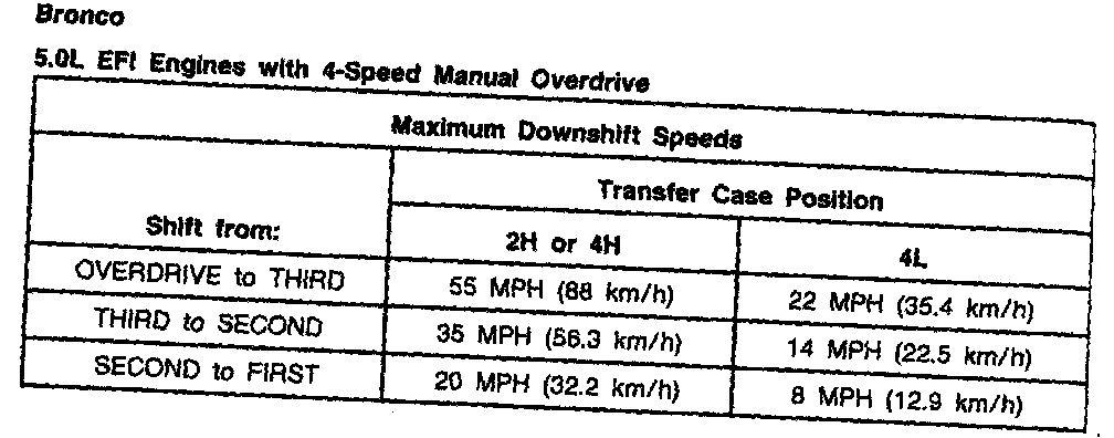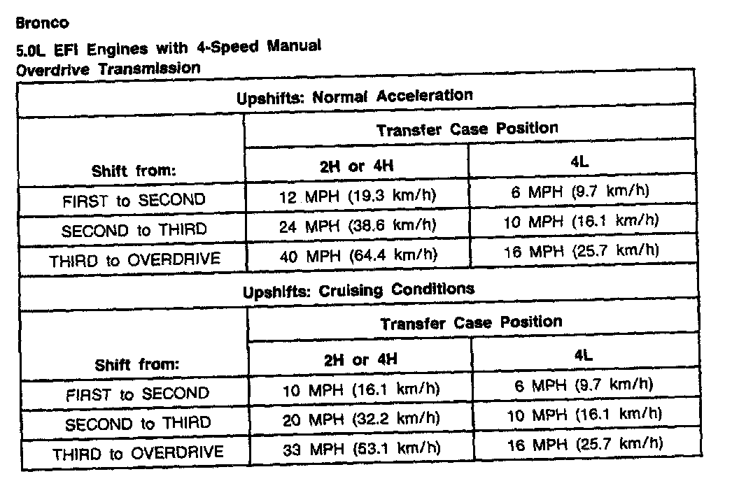 Ford Overdrive 4-spd M/T, Shift Speeds (5.0L Bronco):