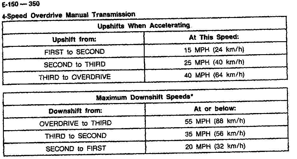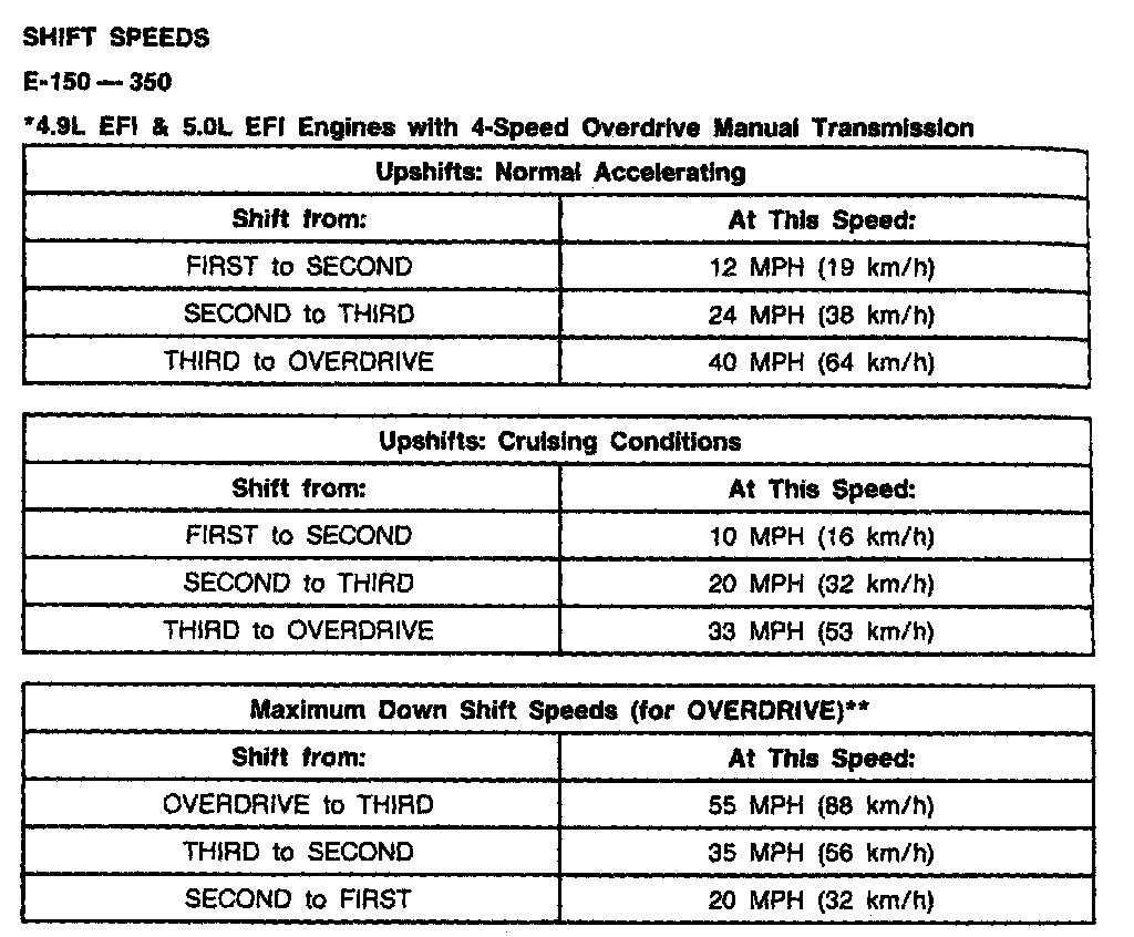 Ford Overdrive 4-spd M/T, Shift Speeds (4.9L/5.0L E150-350):