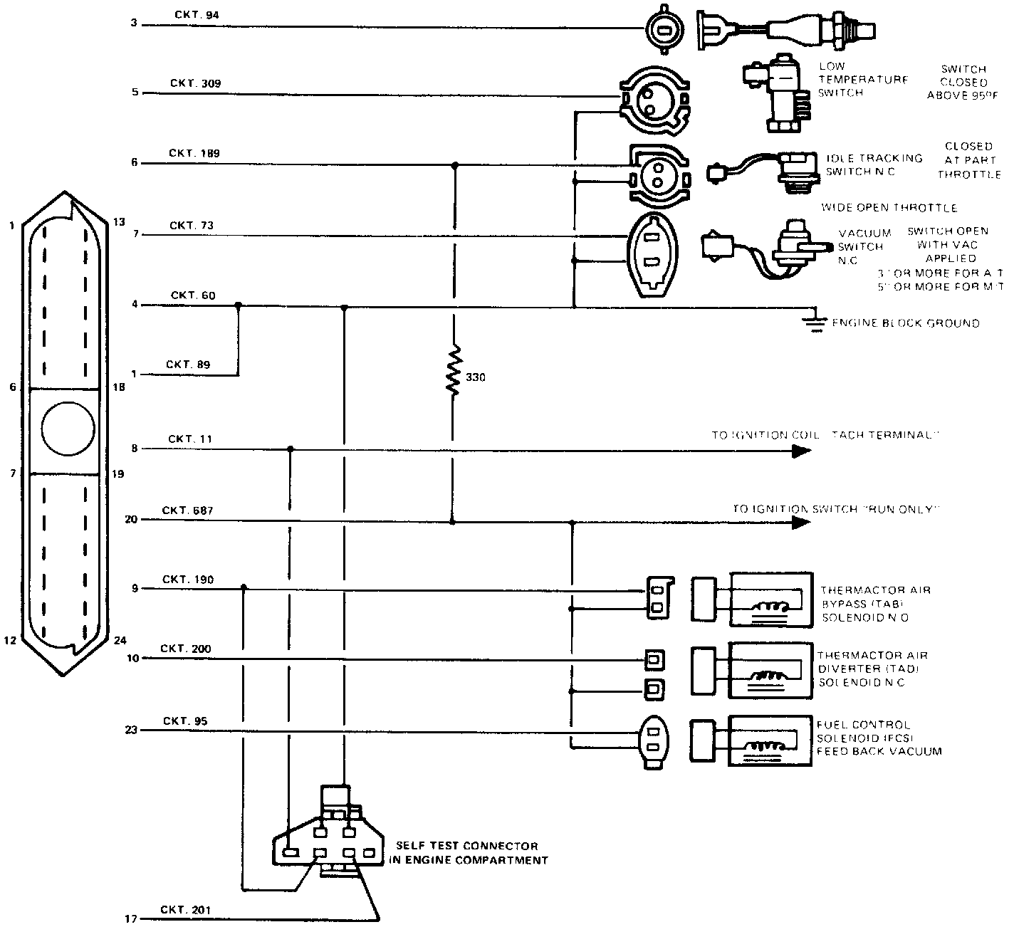 3. Check circuits 190, 201 and 60 between MCU and Self-Test connector for continuity, and make sure that circuit 190 is not shorted to ground. If circuits are okay, proceed to next step. If not, repair circuit(s).