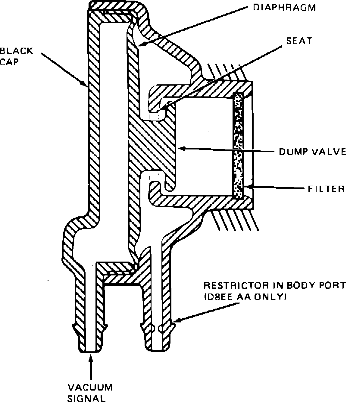 Vacuum vent valves, Fig. 39, used on some vehicles, control the induction of fresh air into a vacuum system to prevent chemical decay of vacuum diaphragms that can occur on contact with fuel vapors. Two types of valves are used, the black color coded valve is a vent valve only, while the natural color coded valve is a combination vent and delay valve.