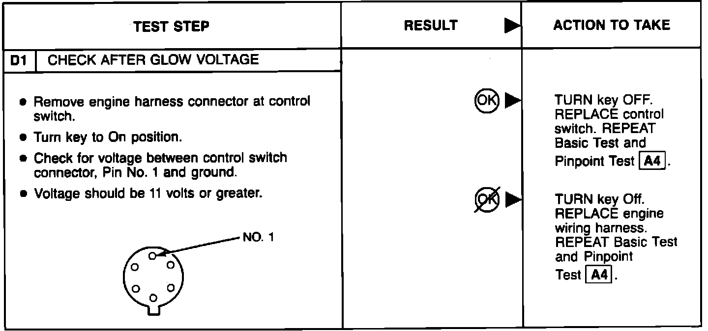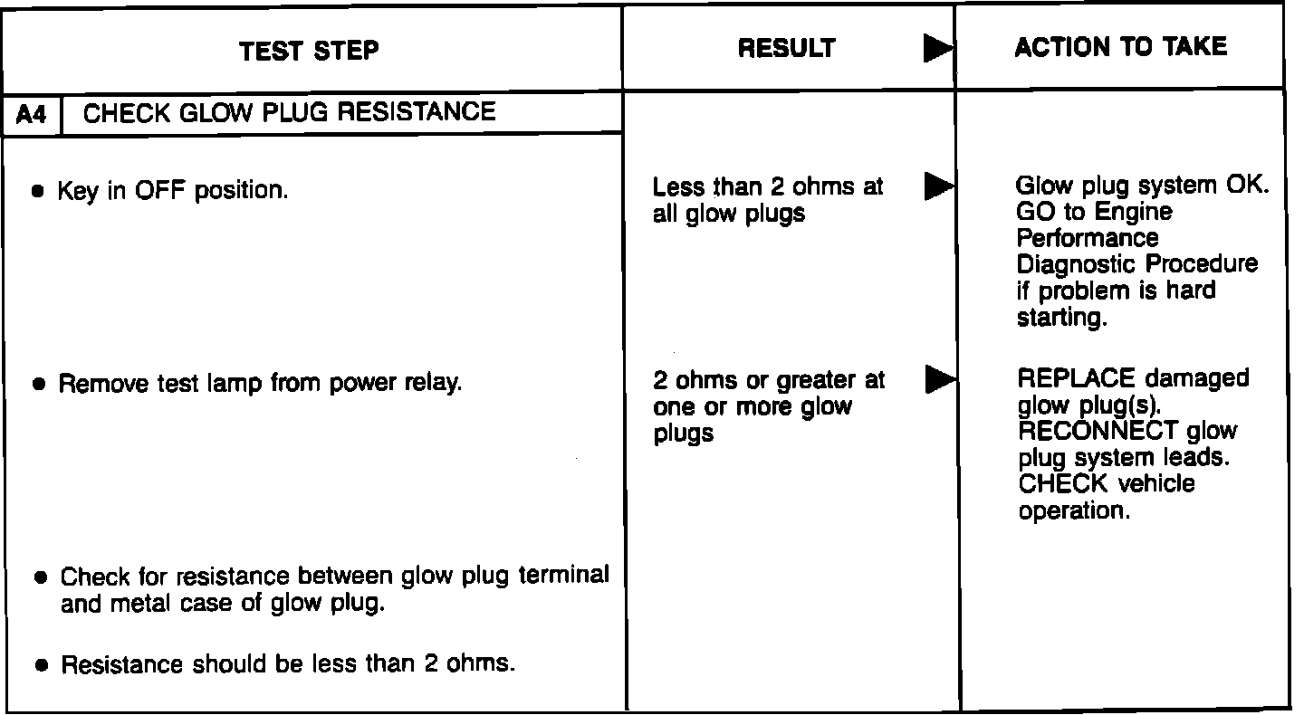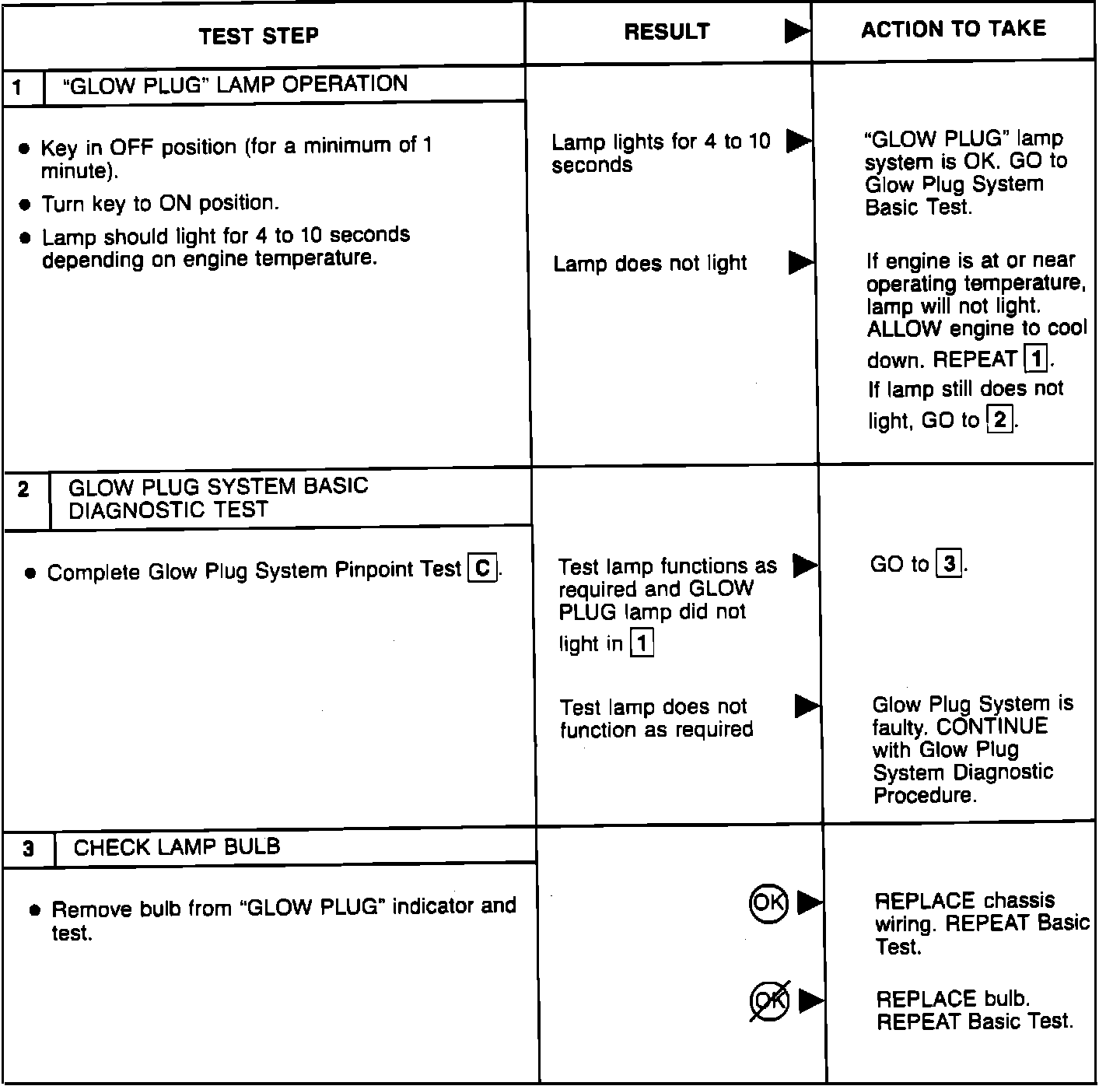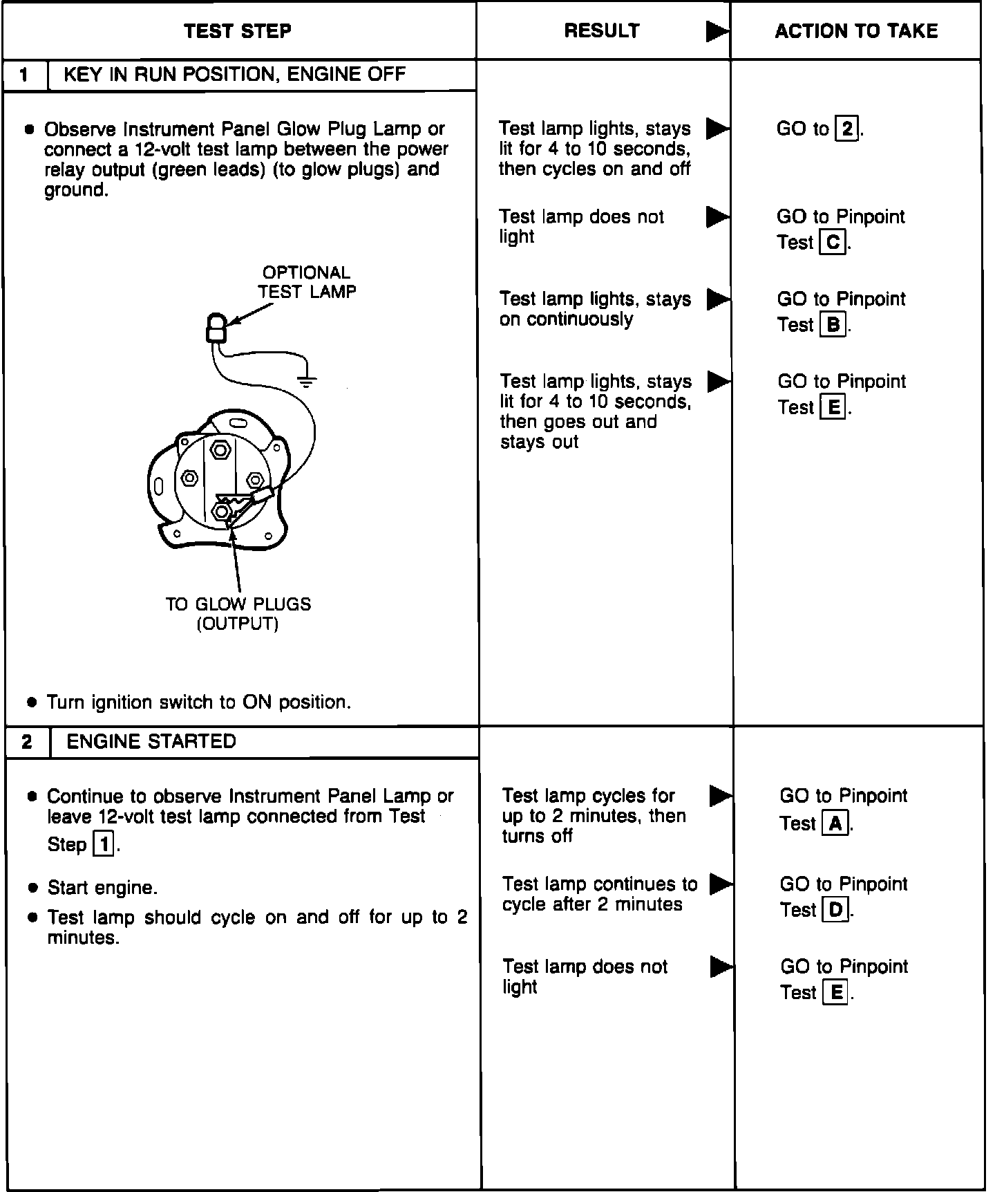 BASIC TESTPerform the glow plug system diagnostic test (referred as Basic test) first. If the vehicle passes the Basic test without running any Pinpoint tests, you will know the glow plug system is functioning properly. The vehicle's problem exists somewhere else other than the glow plug system. If a step of the Basic test fails, run only the Pinpoint test specified by the failed step. Refer to glow plug diagnostic test point chart for test lamp connections and glow plug system wiring harness test points. Perform only those services specified by the Pinpoint tests. Operation of the glow plug system is completely automatic. If after completing a specific Pinpoint test it is determined that a component must be replaced, the glow plugs should be disconnected until the system has been rechecked by repeating the Basic test to make sure the glow plug system works properly.