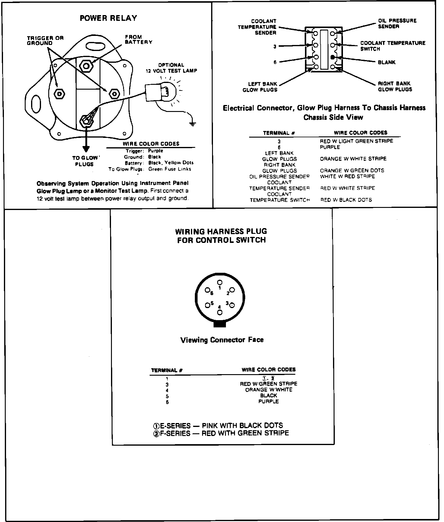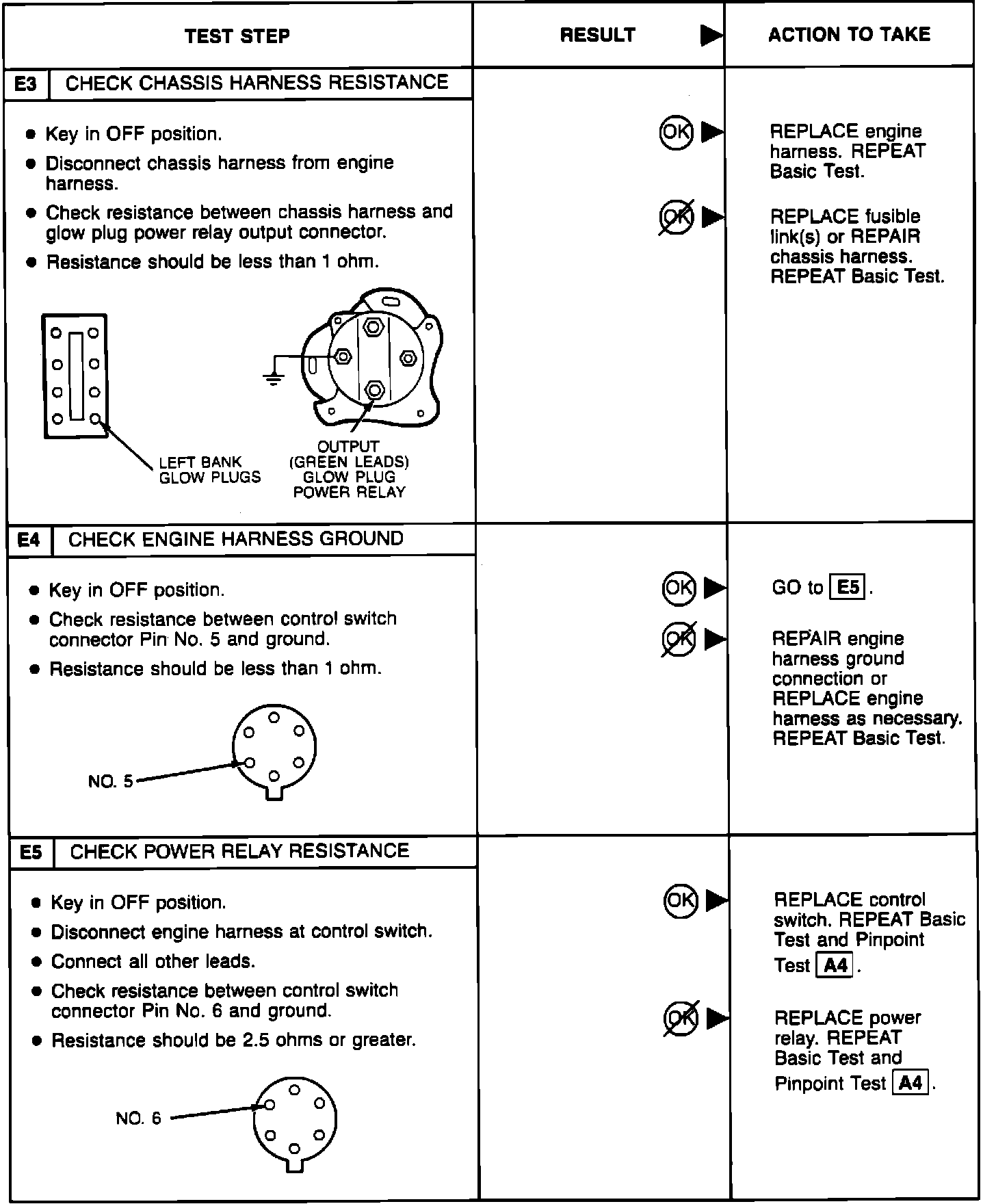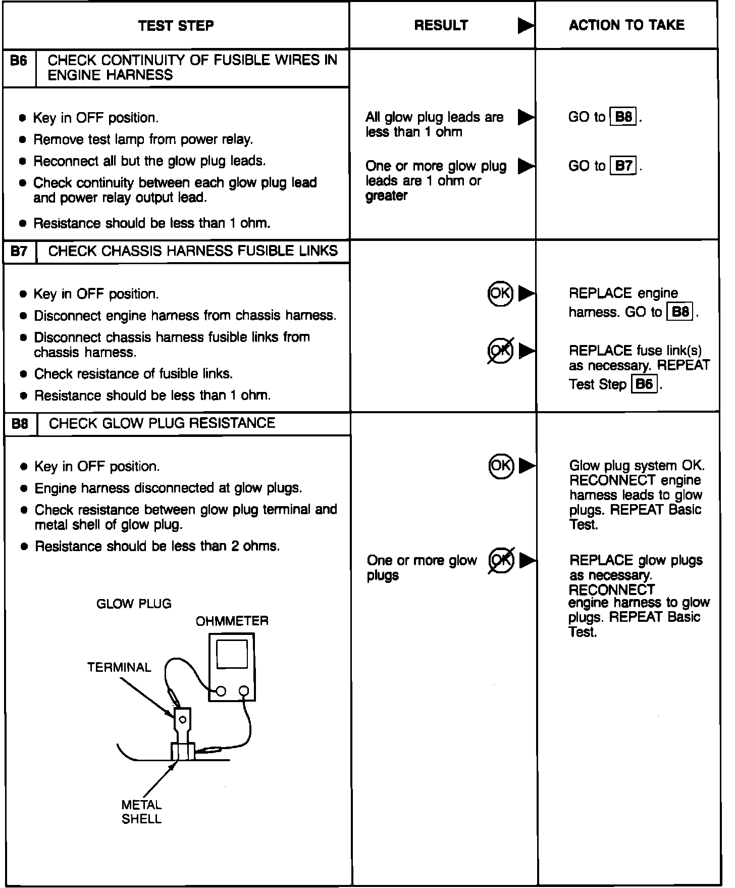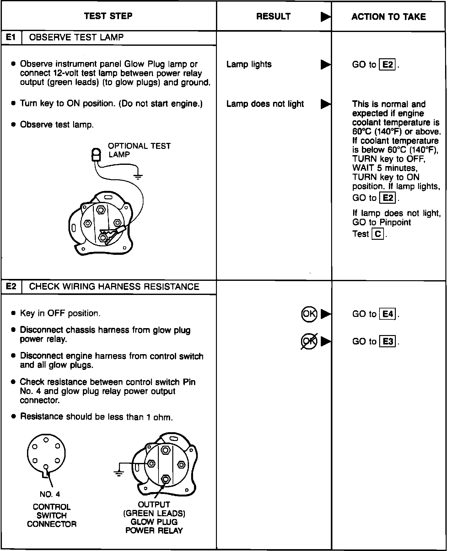 BASIC TESTPerform the glow plug system diagnostic test (referred as Basic test) first. If the vehicle passes the Basic test without running any Pinpoint tests, you will know the glow plug system is functioning properly. The vehicle's problem exists somewhere else other than the glow plug system. If a step of the Basic test fails, run only the Pinpoint test specified by the failed step. Refer to glow plug diagnostic test point chart for test lamp connections and glow plug system wiring harness test points. Perform only those services specified by the Pinpoint tests. Operation of the glow plug system is completely automatic. If after completing a specific Pinpoint test it is determined that a component must be replaced, the glow plugs should be disconnected until the system has been rechecked by repeating the Basic test to make sure the glow plug system works properly.