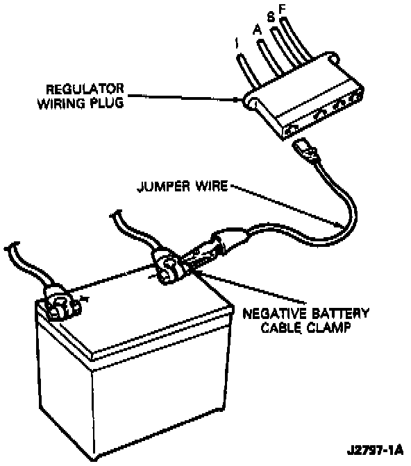 3. Connect a jumper wire from the I terminal of the regulator wiring plug to the negative battery post cable clamp.