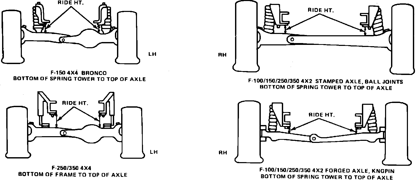 Prior to checking caster and camber, ensure vehicle front ride height is within {1/8} inch side to side 1980-87 E-100-350. On 1980-87 F-100-350 models, the left side ride height should be within 0-{3/8} inch higher than the right side ride height. On 1980-87 F-150-350 (4x4) and Bronco, the front ride heights should be within {3/16} inch side to side. Refer to Figs. 6, 7 and 8. If the vehicle ride heights are not within specifications, redistribute load on loaded vehicles or slightly load empty vehicles on one side. If the ride heights cannot be brought within specifications, verify correct spring installation. The ride height variations stated, are for checking purposes only. The vehicle does not have to operate within these specifications. Check and correct as necessary all tire inflation pressures, then check front tires for the same size, ply rating and load range. Check front wheel bearings and adjust as necessary.