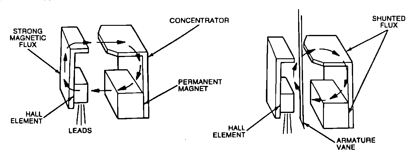 The output signal to the Darlington amplifier is high when the window (on the armature) allows the magnetic field to reach the Hall device (switch off) Fig. 23. When the TAB shunts the magnetic field (closes) away from the Hall device the signal is low to the Darlington amplifier (switch on).