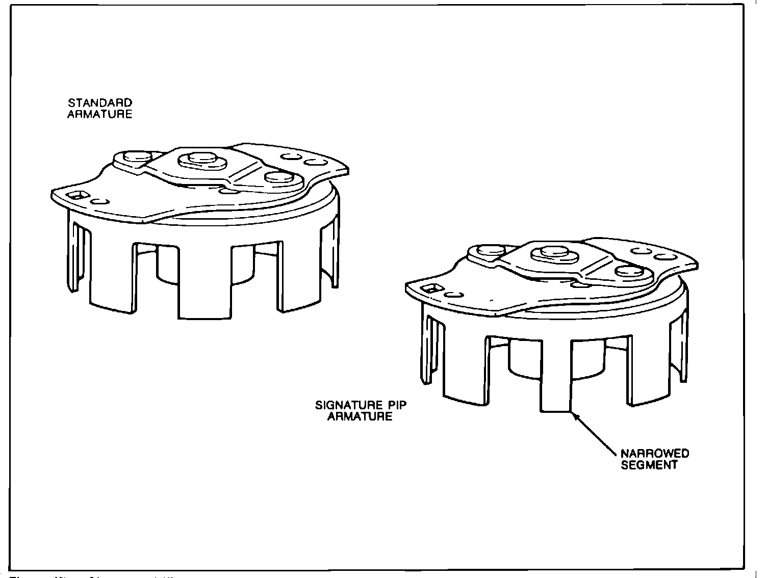 Some Electronic Engine Control (EEC) vehicles are equipped with a signature profile ignition pickup signal. The regular type armature used for the PIP signal has the same size tabs and windows. In a signature PIP signal armature, one of the tabs is narrower than the others Fig. 25.