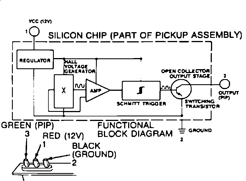 The Hall Effect device is made up of a voltage regulator, a Hall voltage generator, Darlington amplifier, Schmitt trigger, and an open collector output stage integrated in a single monolithic silicon chip Fig. 22. A signal is produced when a ferrous material is passed through the opening and the flux lines decrease.