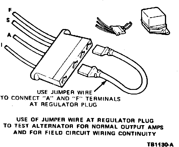 3. Connect a jumper wire between the ``A'' and ``F'' terminals of the voltage regulator wiring connector, Fig. 9.