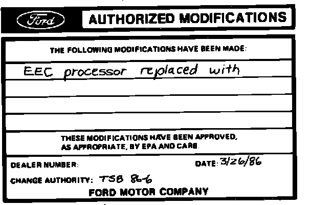 Obtain an Authorized Modifications Decal and list the date, dealer number, and summary of alterations performed. Select a prominent place adjacent to the Vehicle Emission Control Information Decal suitable for installing the Authorized Modifications Decal. Clean the area, install the decal, and cover it with a clear plastic decal shield.