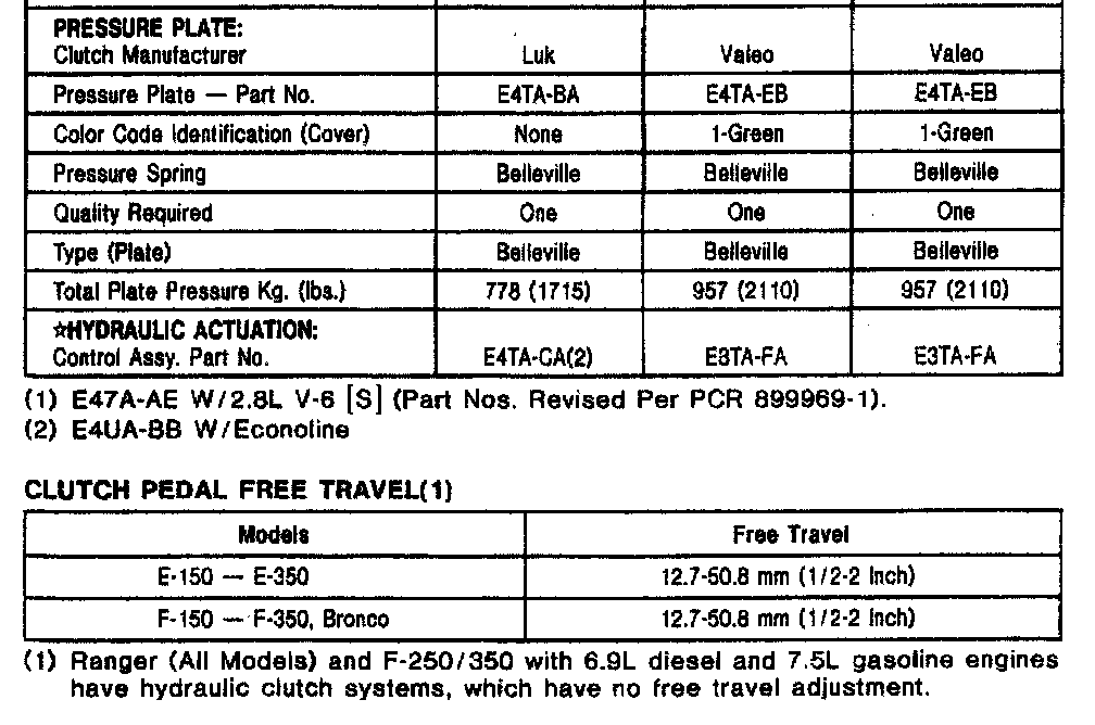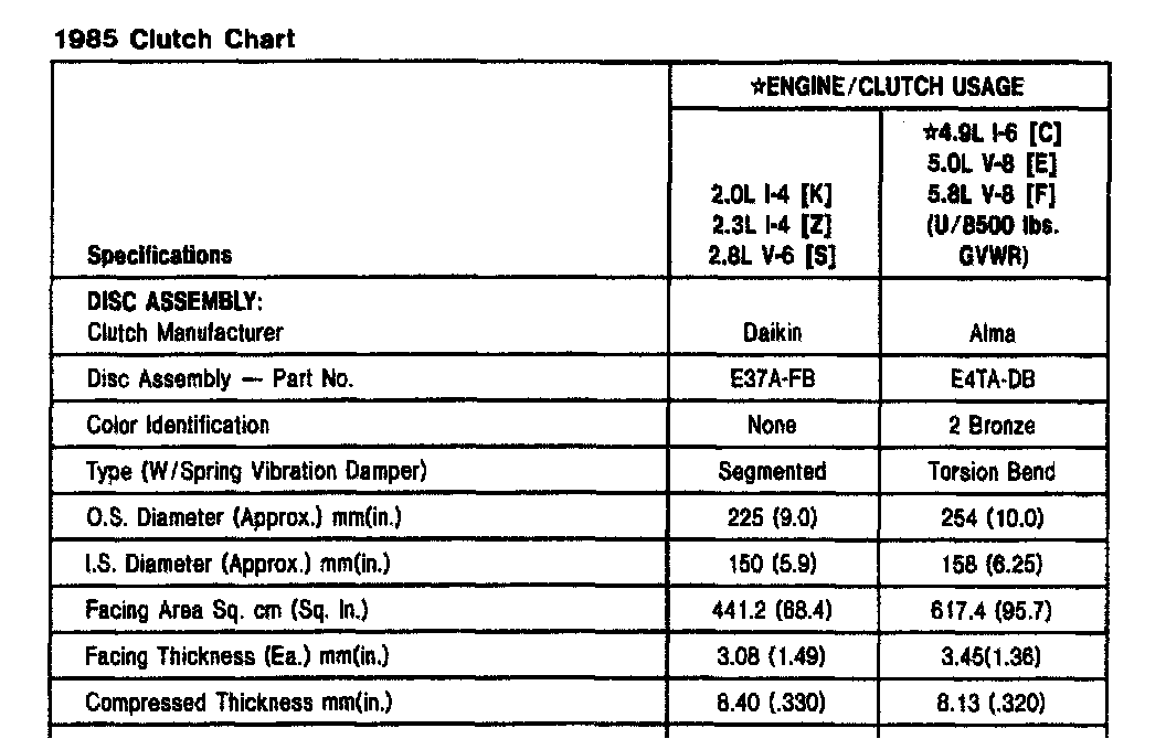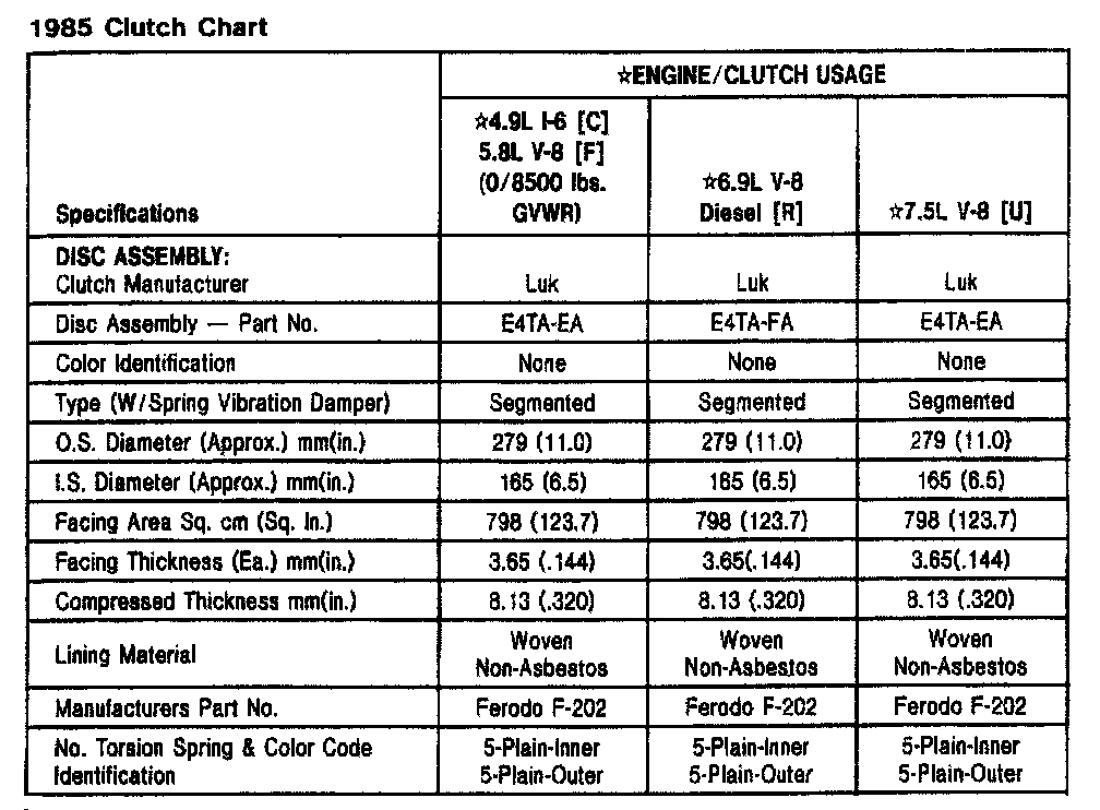 Ford 3.03 3-spd M/T, Clutch Chart (E-150-350, F-150-350):