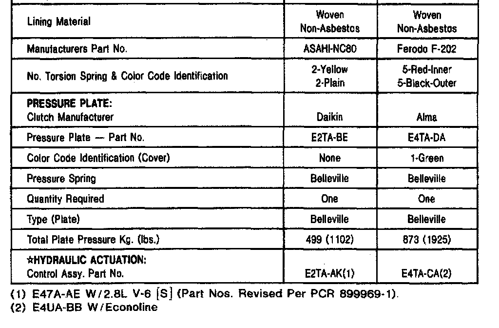 Ford 3.03 3-spd M/T, Clutch Chart (E150-350, F150-350):