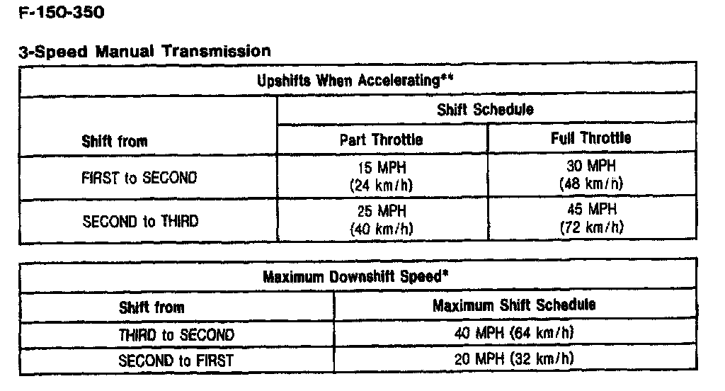 Ford 3.03 3-spd M/T, Shift Speeds (F150-350):