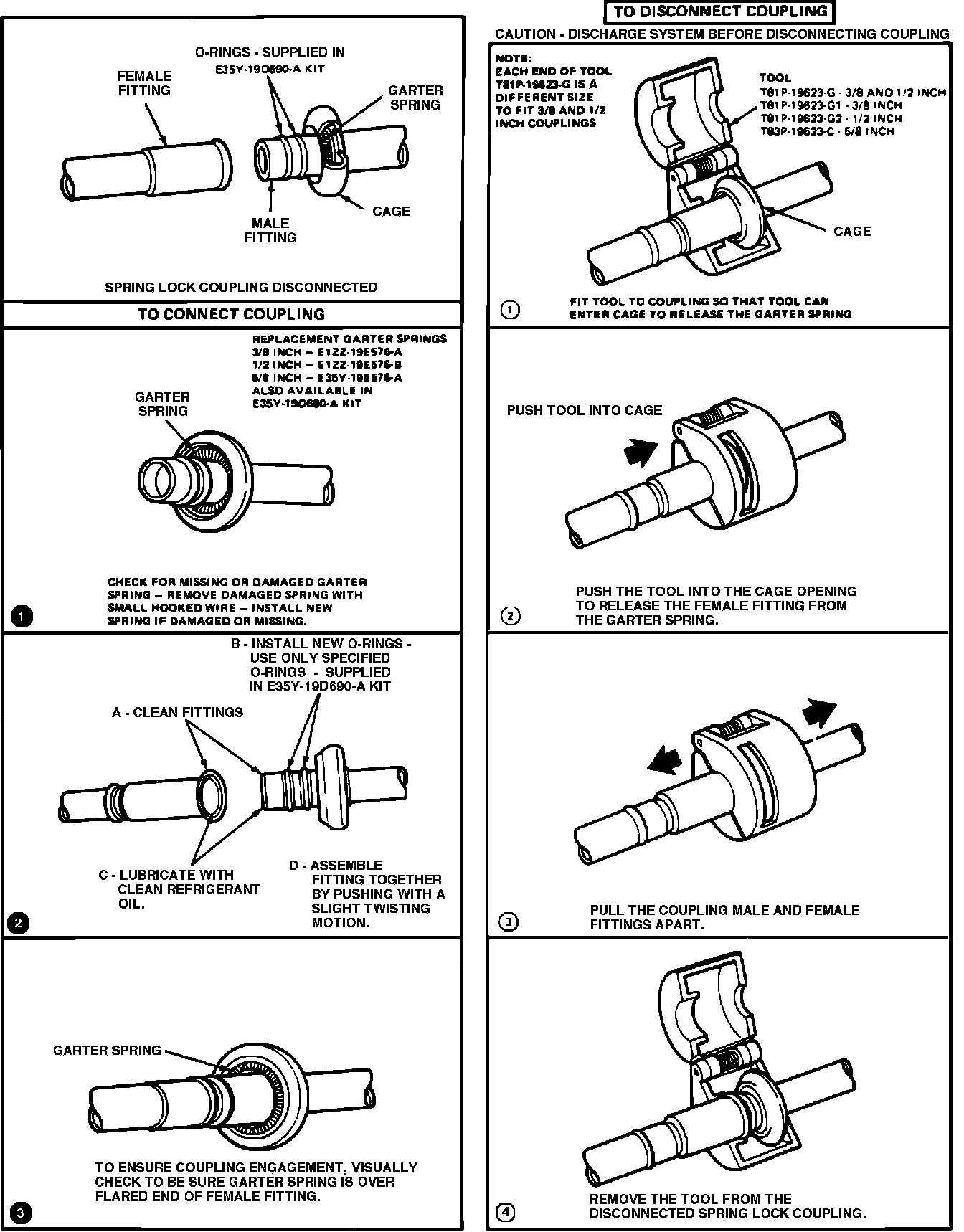 2. Disconnect compressor discharge line and liquid line from condenser, and cap both lines. These vehicles are equipped with spring lock couplings, Fig. 2.
