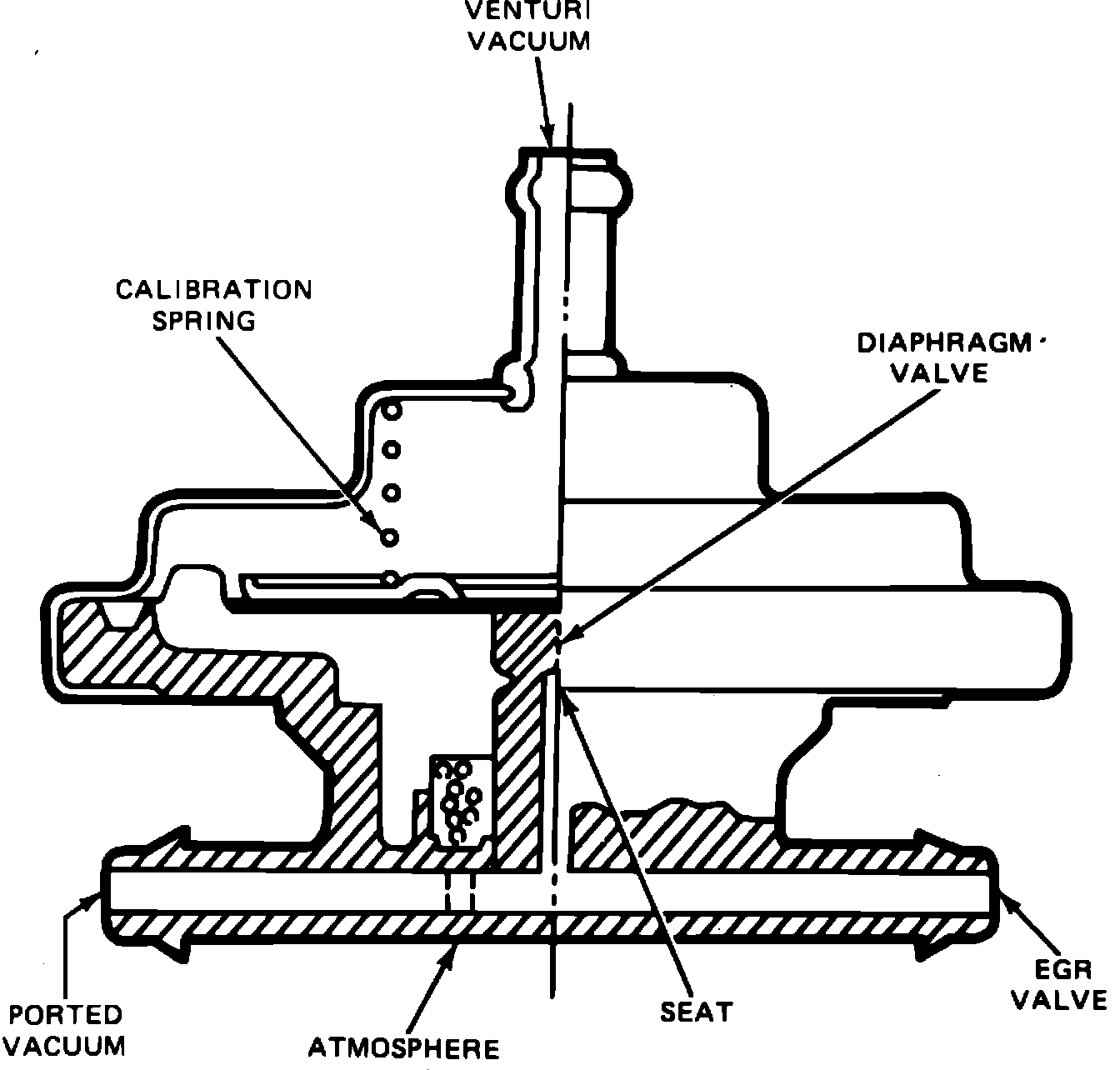 This valve, Fig. 40, used on some vehicles, closes the EGR valve when the engine requires maximum power at or near wide open throttle. This valve is installed in the vacuum line between the ported vacuum connection on the carburetor and EGR valve. A vacuum line from the carburetor venturi vacuum tap is connected to the top port on the valve and provides control for the valve. When venturi vacuum signal is at a predetermined level near wide open throttle, it is strong enough to overcome the calibration spring pressure and unseat the diaphragm valve, diverting EGR source vacuum to the atmosphere and causing the EGR valve to close. Normal EGR flow is resumed when there is a reduction in engine load from the wide open throttle position.