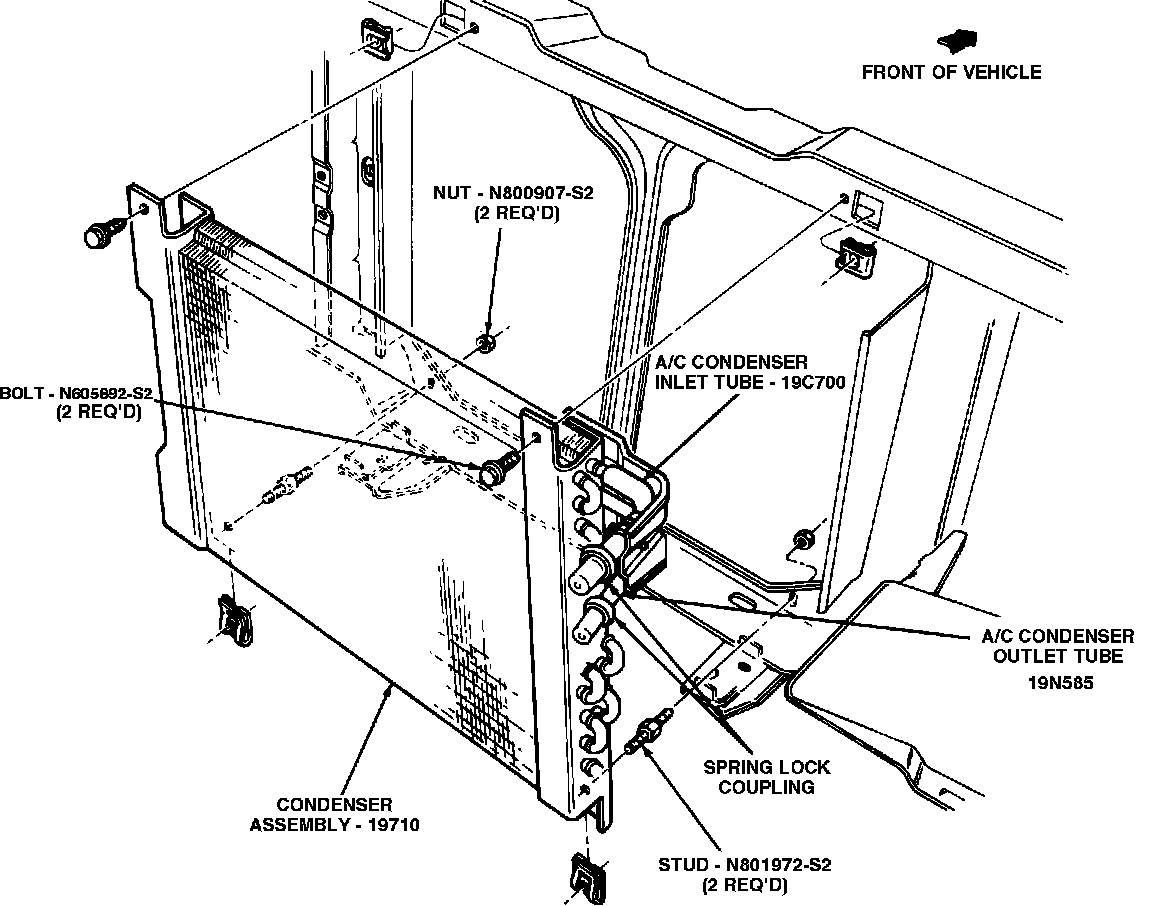 2. Disconnect compressor discharge line and liquid line from condenser, and cap both lines. These vehicles are equipped with spring lock couplings, Fig. 2.