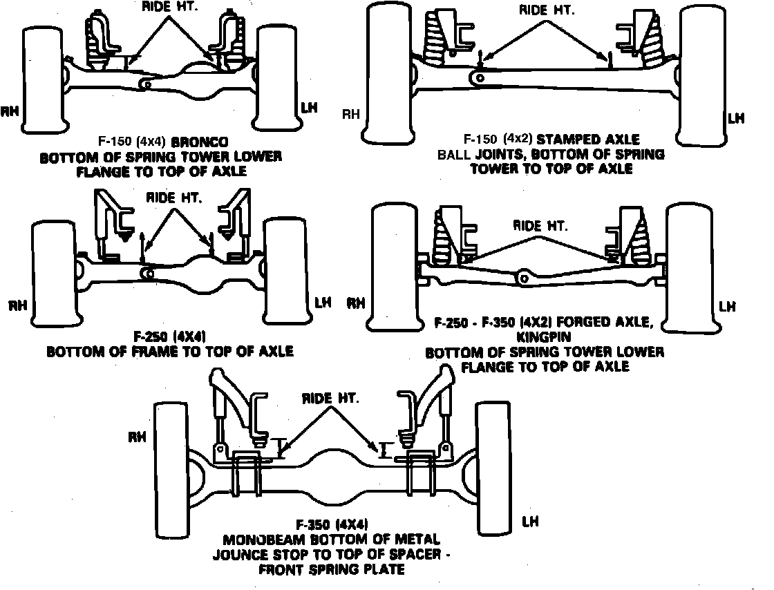 Prior to checking caster and camber, ensure vehicle front ride height is within 1/8 inch side to side on E-150-350. On F-150-350 models, the left side ride height should be within 0 to 3/8 inch higher than the right side ride height. On F-150-350 (4x4) and Bronco, the front ride heights should be within 3/16 inch side to side. Refer to Figs. 1 and 2. If the vehicle ride heights are not within specifications, redistribute load on loaded vehicles or slightly load empty vehicles on one side. If the ride heights cannot be brought within specifications, verify correct spring installation. The ride height variations stated, are for checking purposes only. The vehicle does not have to operate within these specifications.
