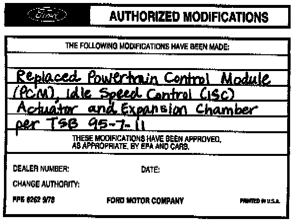 Obtain an Authorized Modifications Decal and list the date, dealer number, and summary of modifications performed. Select a prominent place adjacent to the Vehicle Emission Control Information Decal suitable for installing the Authorized Modifications Decal. Clean the area, install the decal, and cover it with a clear plastic decal shield.