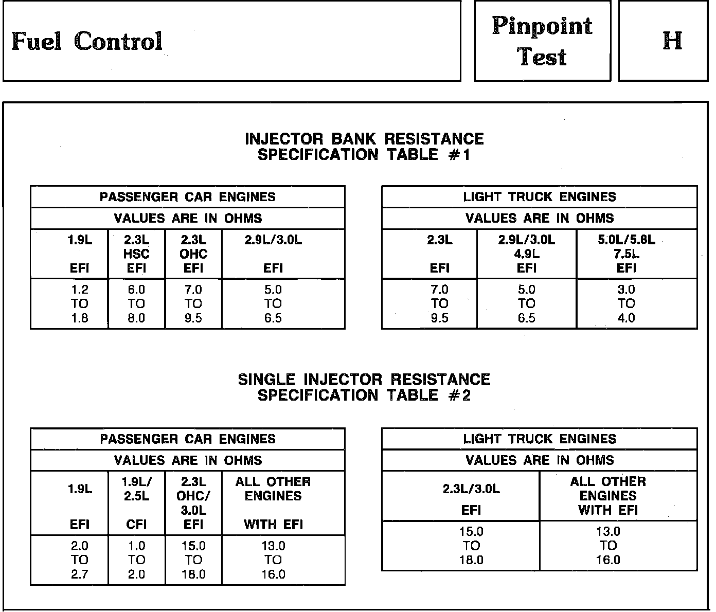 H - Fuel Injector Resistance Specification Table