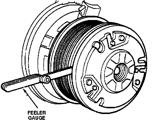 6. Check clutch air gap between hub and pulley mating surface in three locations equally spaced, Fig. 6. Rotate pulley one-half turn and check again. The smallest air gap must be within specification, refer to ``Air Conditioning Specifications'' section. Add or remove shims until desired limit is attained.