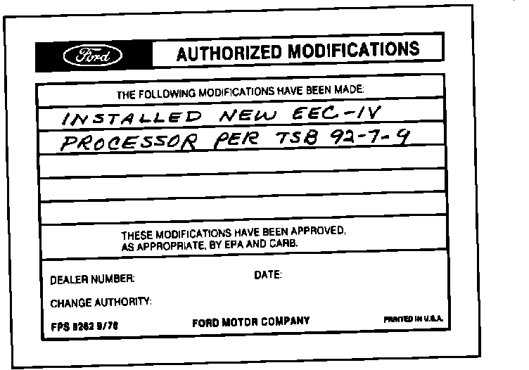 Obtain an Authorized Modifications Decal and list the date, dealer number, and summary of alterations performed. Select a prominent place adjacent to the Vehicle Emission Control Information Decal suitable for installing the Authorized Modifications Decal. Clean the area, install the decal, and cover it with a clear plastic decal shield.