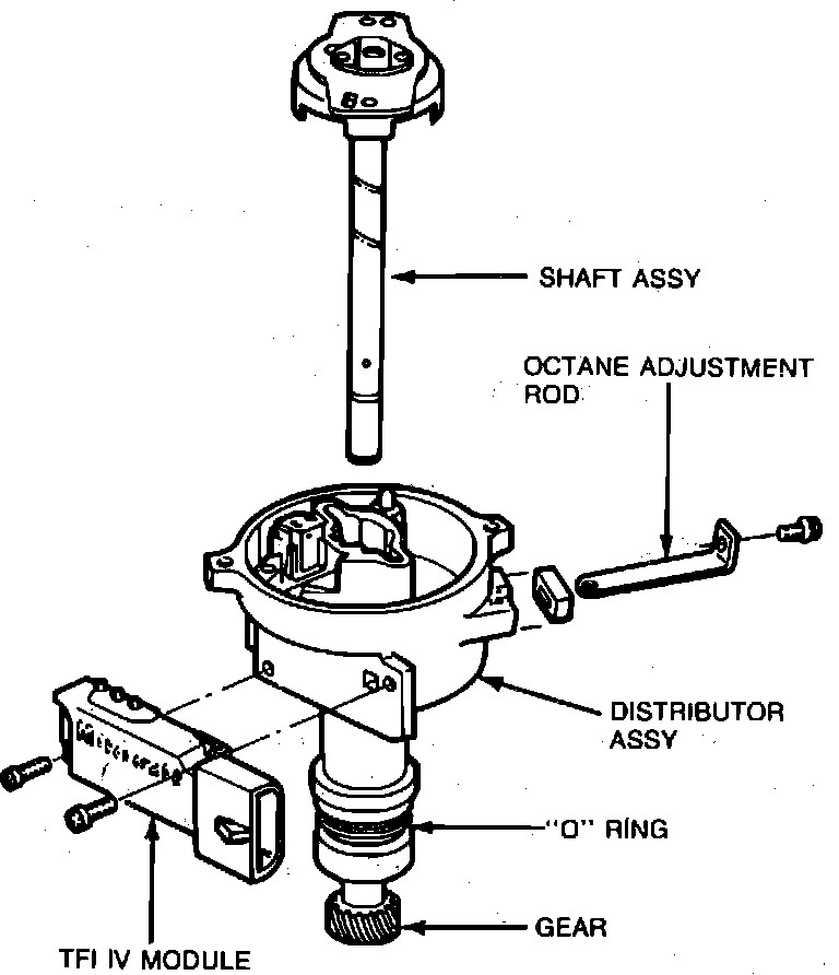 5. Remove the two Thick Film Ignition (TFI) module retaining screws, then slide the module down to disengage the module connector pins from the stator. Remove the TFI module from the distributor.