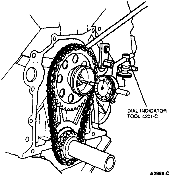 a. Push camshaft toward rear of engine. Install Dial Indicator TOOL-4201-C or equivalent so indicator point is on camshaft sprocket attaching screw.