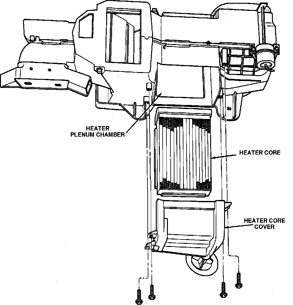 4. Pull heater core rearward and down, removing it from plenum assembly.