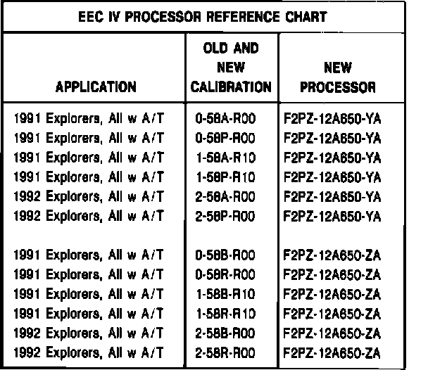 a. Verify the processor part number. If not already updated, install a new EEC IV processor. Refer to the EEC IV Processor Application Chart contained in this TSB article for correct parts usage.