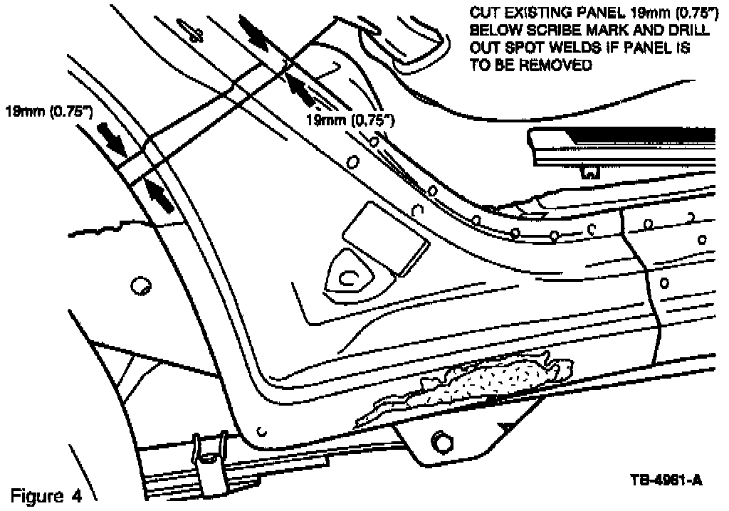 THE NEW COVERS ARE DESIGNED TO BE INSTALLED DIRECTLY ON TOP OF THE EXISTING PANELS. HOWEVER, IF THE CORROSION IS SEVERE, IT MAY BE APPROPRIATE TO REMOVE PART OF THE ORIGINAL PANEL (FIGURE 3). HOLE PUNCH COVER FLANGES AND GRIND OLD SPOT WELD AREAS AS NECESSARY FOR PROPER COVER FIT.