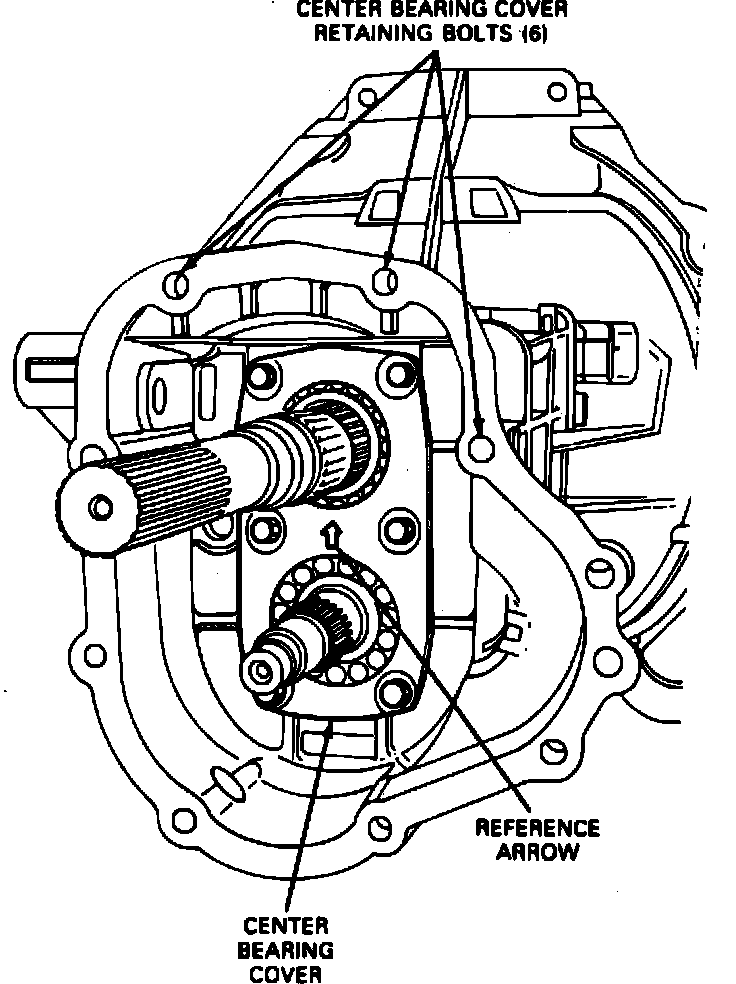 6. Install center bearing cover onto transmission case with reference arrow pointing upward. Insert center bearing cover retaining bolts, then torque to 14-19 ft lbs. Ensure all center bearing cover retaining bolt heads are marked with an ``8.'