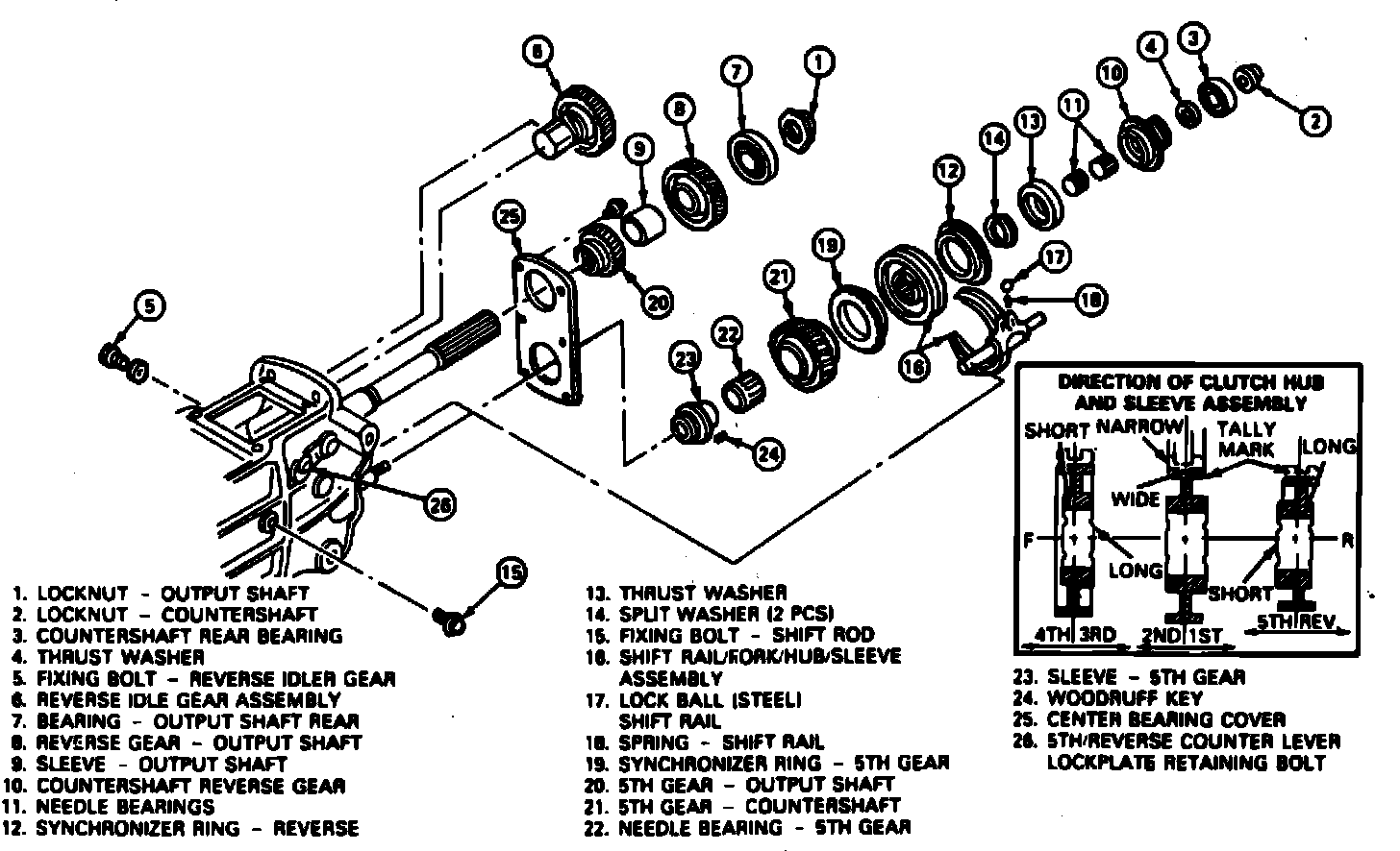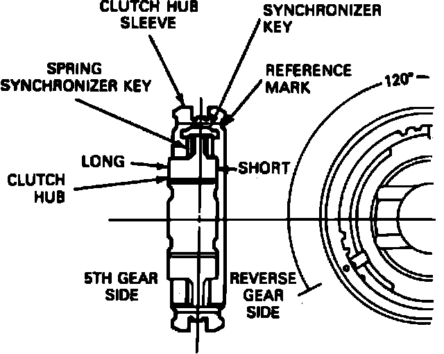 NOTE: Install longer flange(on the fifth/reverse hub, sleeve, and synchronizer assembly) toward front of transmission. Reference mark on synchronizer sleeve must be installed toward reverse side of gear.