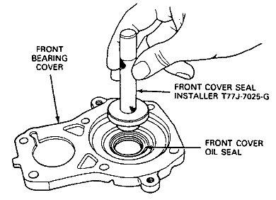7. Position transmission with input shaft and clutch housing facing upward, then install front cover oil seal, using front cover seal installer tool No. T77J-7025-G or equivalent. Ensure input shaft front bearing outer race is squarely positioned in bore.